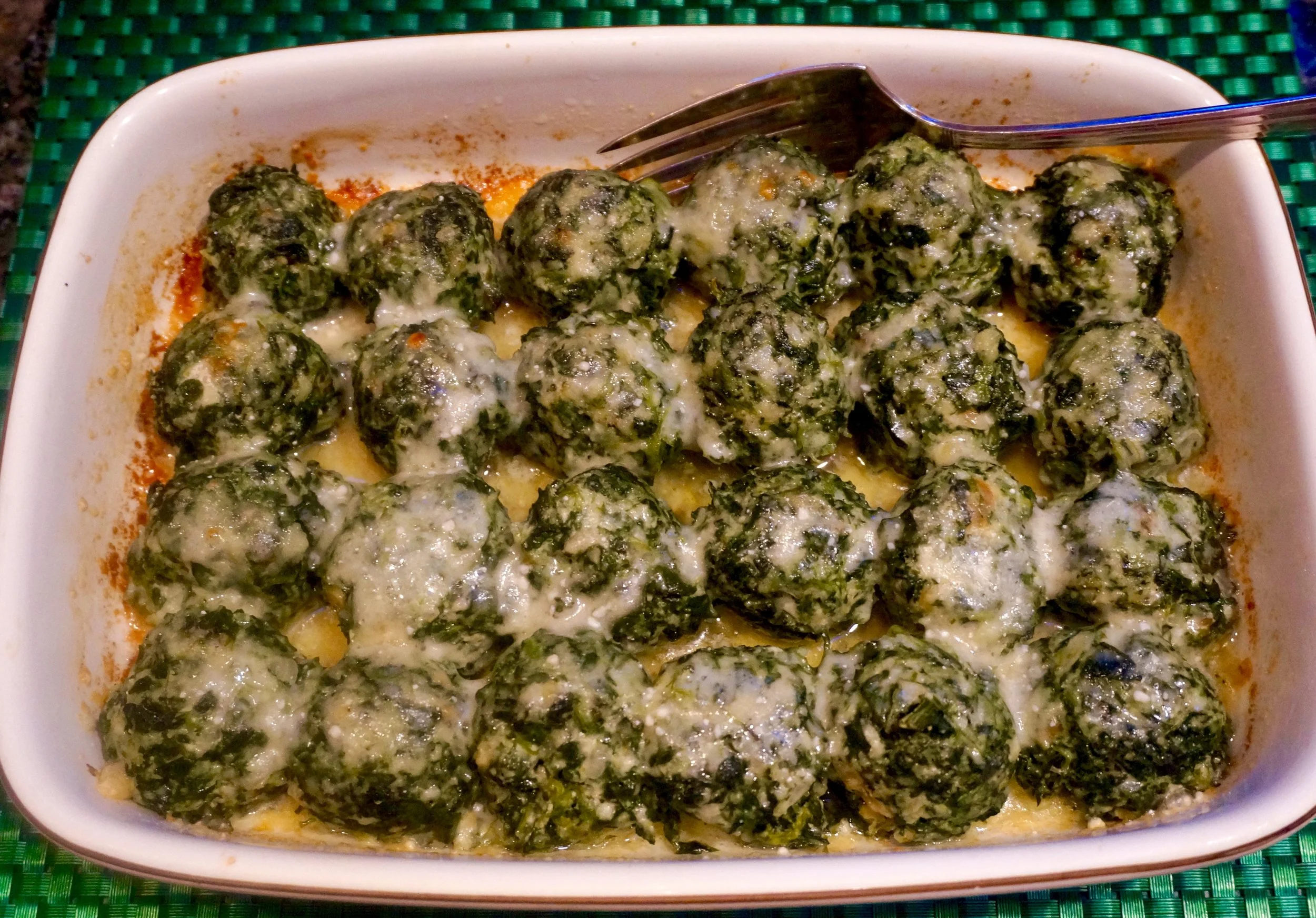 Preheat the oven to 350 degrees. Bring a large pot of salted water to a boil. With floured hands, shape the spinach mixture into balls about 1-1/2-inches in diameter. Gently drop the balls into the water. Keep the water at a simmer. Cook for 6-7 minutes or until the balls rise to the top and look fluffy. Lift the balls with a slotted spoon and place them on paper towels to dry slightly. Place the balls in the buttered baking dish. Drizzle them with melted butter and the 1/2-cup Parmesan cheese. Bake for about 18 minutes or until the cheese is bubbly and lightly crisped.