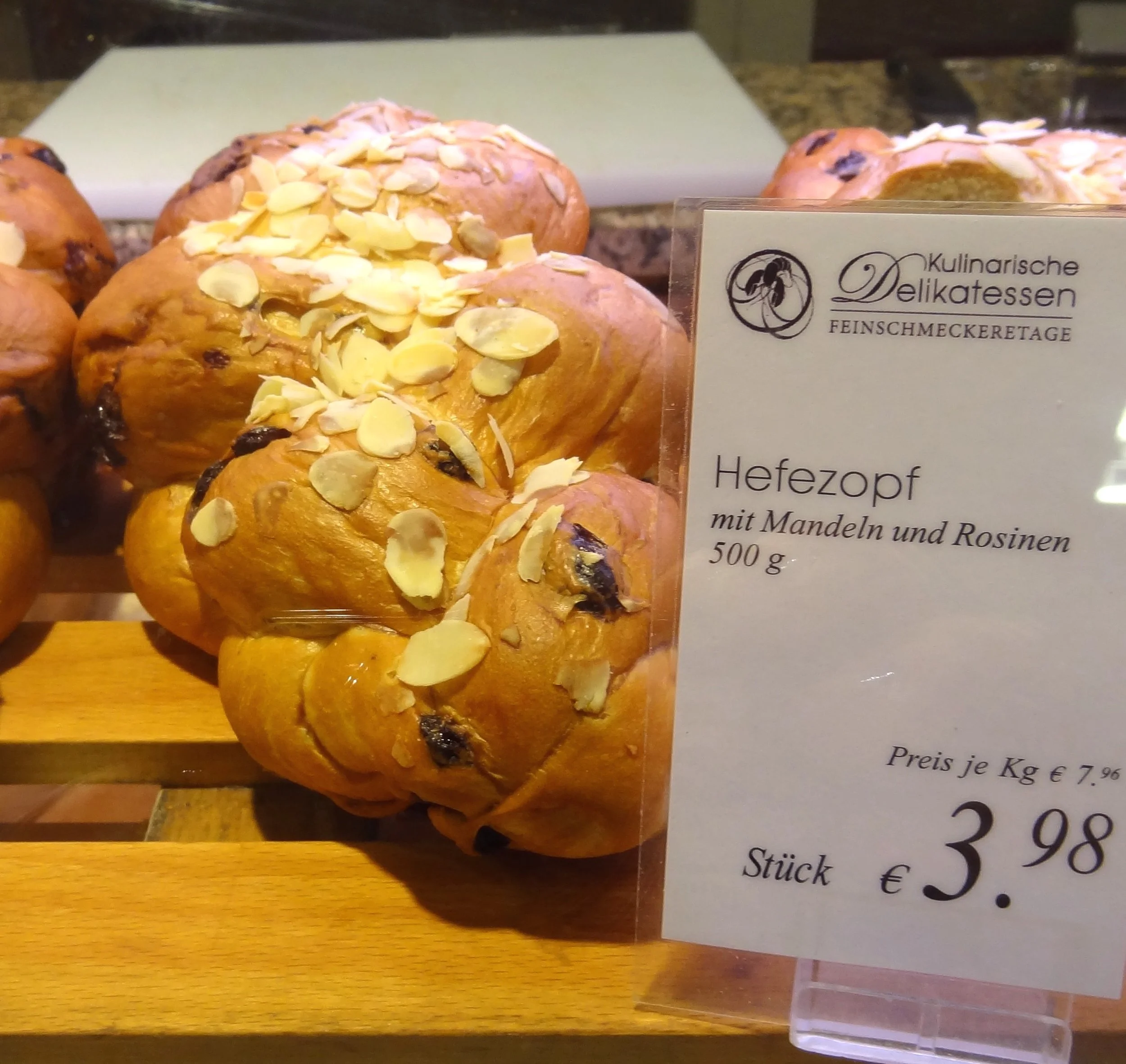 But then we came to the bakery and there, in the case, was a beautiful, braided loaf called Hefezopf, which is like a challah, but with raisins and almonds.