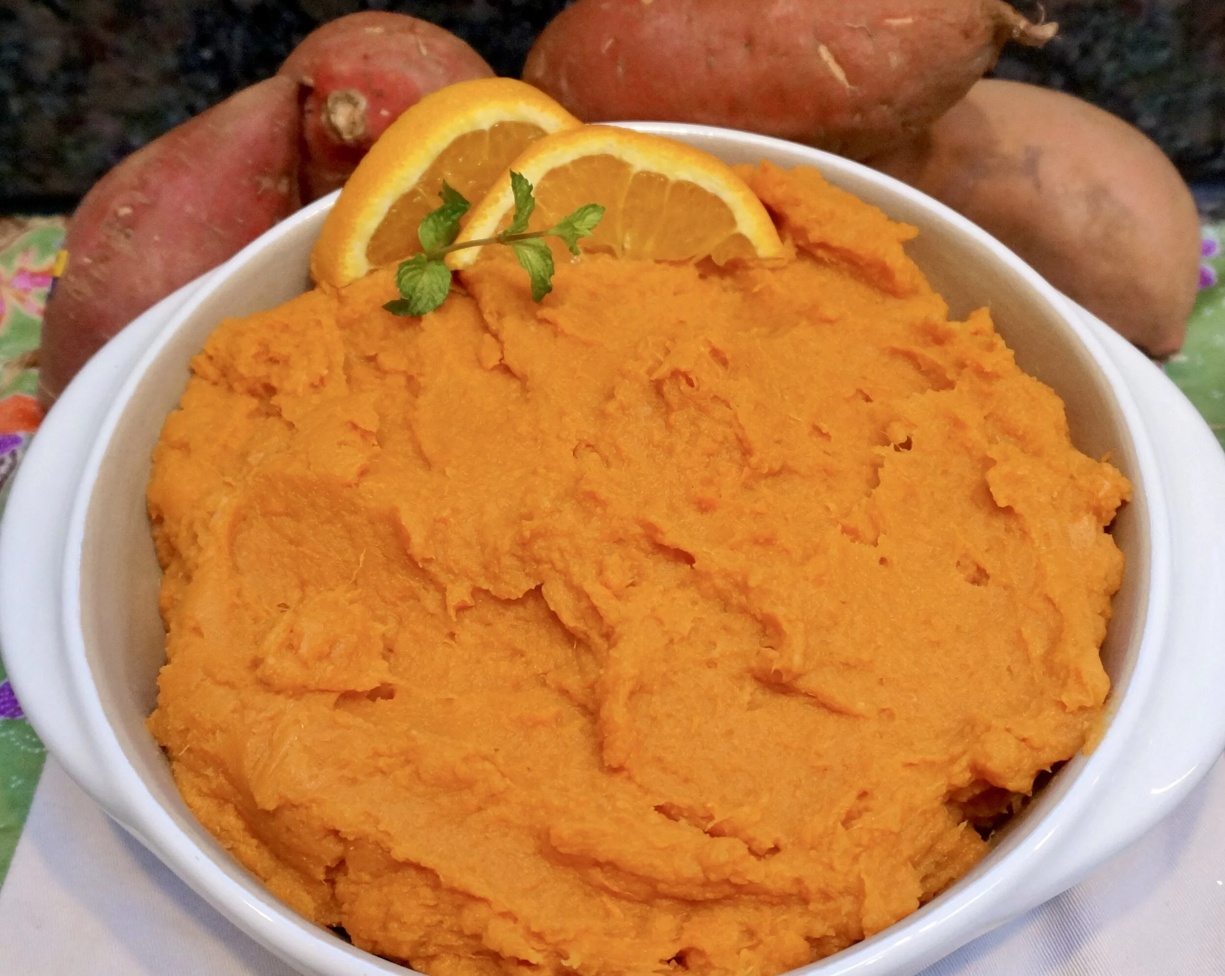 Here’s a recipe for the Mashed Sweet Potatoes. Takes almost no time. No sweetener in these. If you have a sweet tooth you can add some honey or maple syrup. But even someone on a diet can eat these. Sweet potatoes are healthy. No need for the butter either.