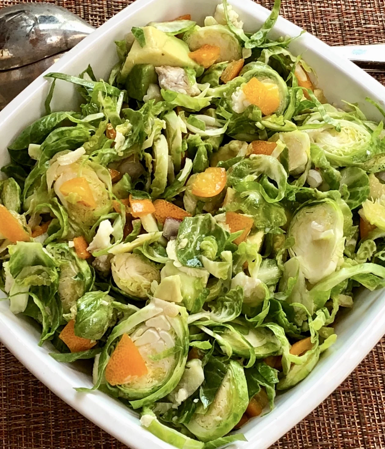 I looked around to see what else I had in my fridge and cupboards that I could use with the kumquats: a few Brussels Sprouts, a couple of avocados, some cheese, and came up with this salad (I made half with cheese, half without.)