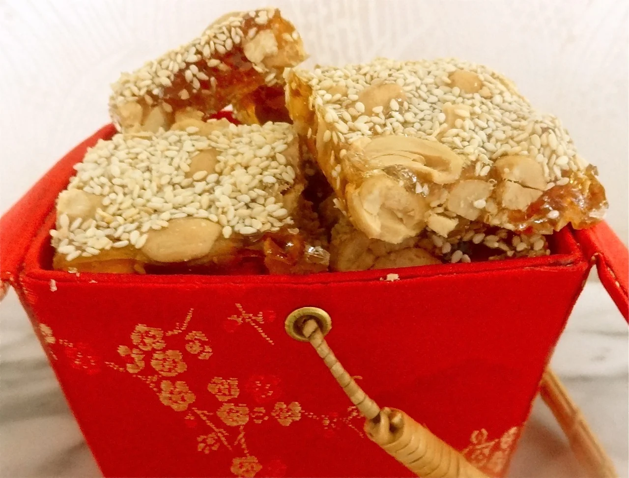 And yet — one of the recipes I learned was one for the kind of Sesame Seed-Nut Brittle I remember my parents buying whenever we visited New York’s Chinatown. It is sweet! And salty too, a nice balance. It’s also crunchy and gets into every tooth.
