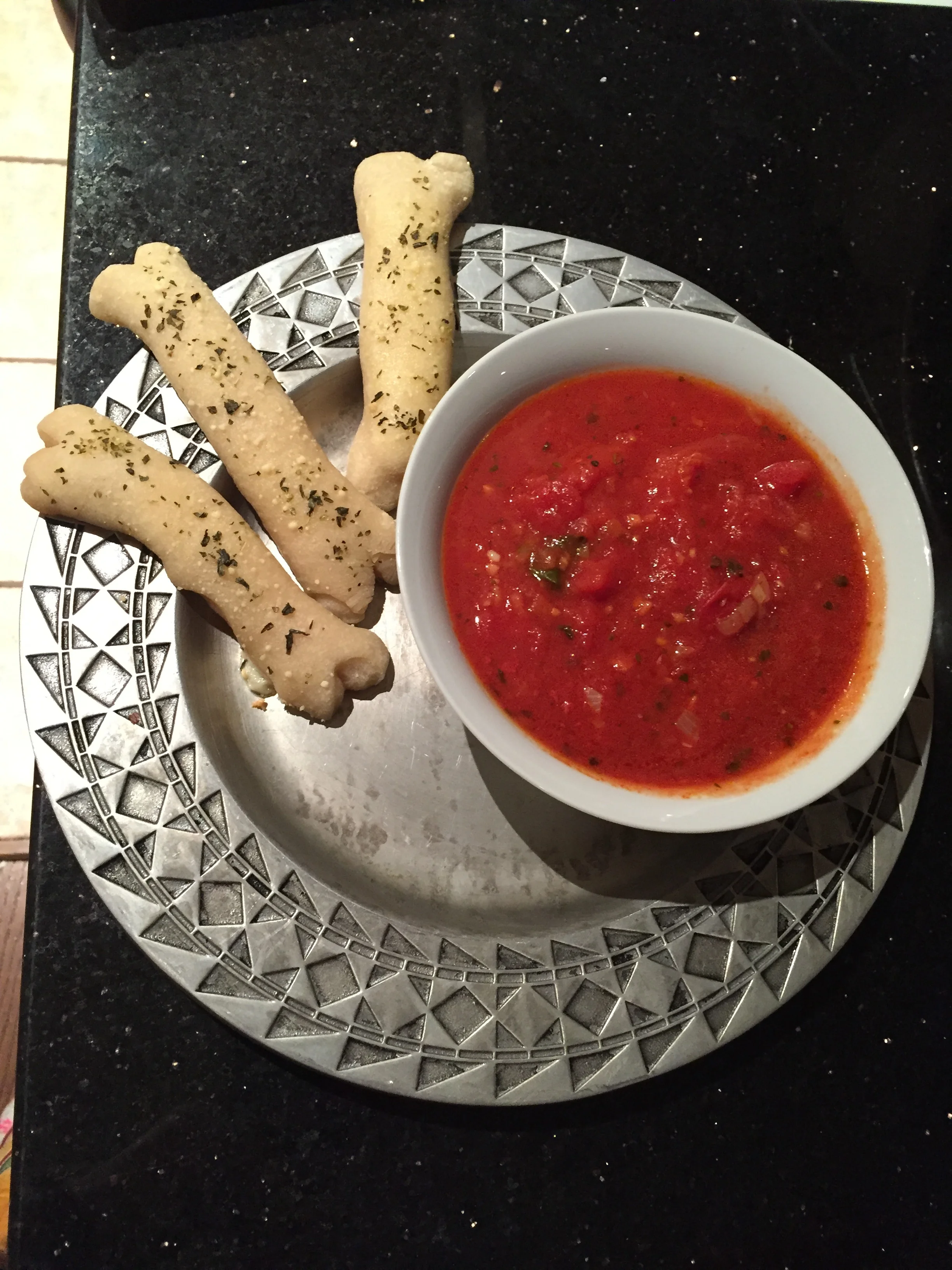 Preheat the oven to 375 degrees. Line a baking sheet with parchment paper. Cut the dough into 10 equal pieces and roll each piece into a rope about 8 inches long. Cut a slit at each end of each rope, and curve the slit part out slightly to make the bone shape. Place the bones on the baking sheet. Brush with the melted butter, sprinkle with the cheese, oregano and salt. Bake for about 15 minutes or until vaguely tan. Serve with the marinara sauce.