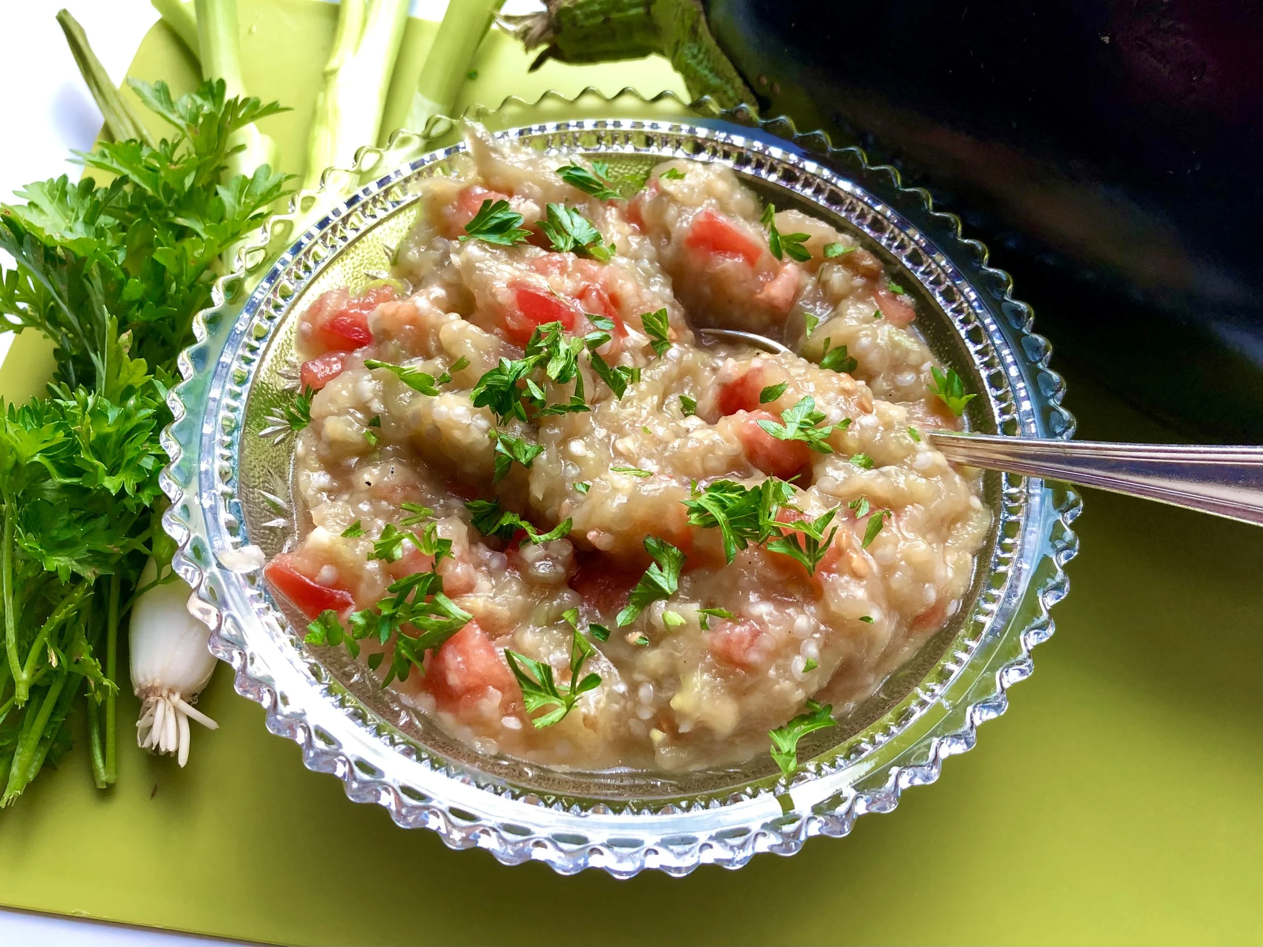 Preheat the oven to 425 degrees. Wash the surface of the eggplant, then wipe it dry. Coat the surface with a thin film of olive oil. Prick the skin in a few places with the tines of a fork. Place the eggplant on a baking sheet and roast for about 25 minutes, turning the eggplant once or twice during the cooking. Remove the eggplant from the oven. When the eggplant is cool enough to handle, remove the skin and stem and place the flesh in a bowl. Mash the eggplant with the back of a fork. Add the scallion, garlic, optional tomato and olive oil and mix the ingredients to distribute them evenly. Add the lemon juice and mix again. Season to taste with salt and pepper; sprinkle with some parsley.