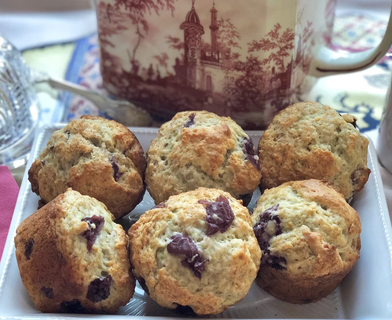 Preheat the oven to 400 degrees. Grease 12 muffin tins. Melt the butter and set it aside to cool. Combine the flour, sugar, baking powder, baking soda, salt and lemon peel in a large bowl. In another bowl, mix the eggs, melted, cooled butter, yogurt, juice and vanilla extract. Pour the liquid ingredients into the dry ones and mix to combine ingredients. Fold in the cherries. Spoon the batter into the prepared muffin tins. Bake for 20-22 minutes or until a cake tester inserted into the center comes out clean.