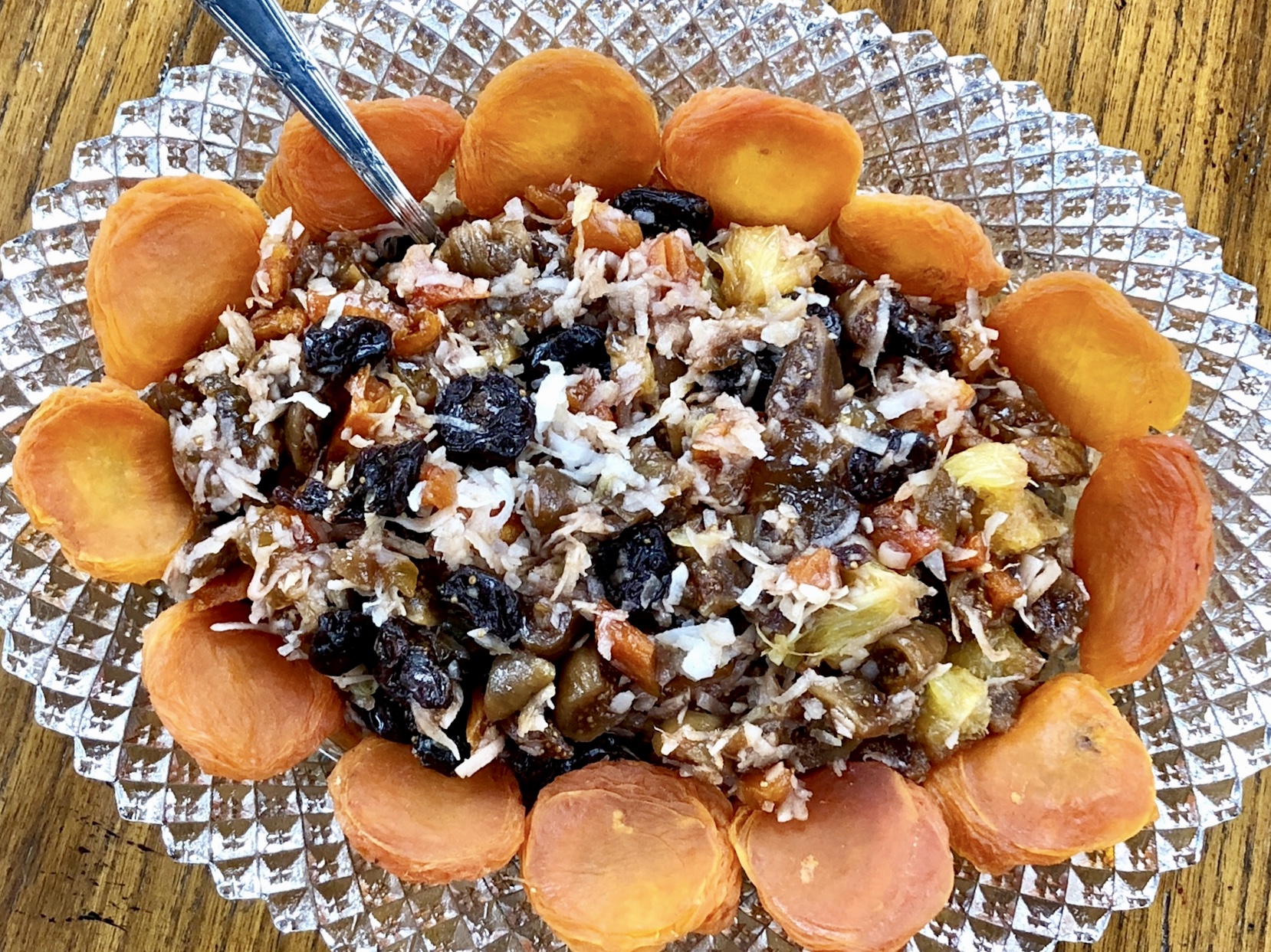 Combine the figs, apricots and cherries in a bowl. Peel the orange and remove the outer white pith (leaving only the orange flesh). Cut the flesh into small pieces and add to the bowl. Add the coconut, ginger, cinnamon apricot jam and wine and mix ingredients. Let rest for at least one hour (preferably several hours) before serving. May be made a day ahead.
