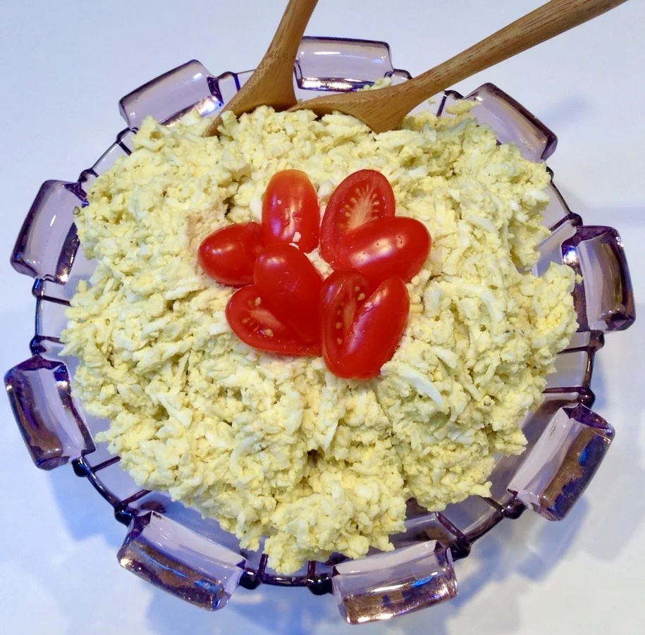 All good. But not plain old egg salad. I am an egg salad purist. I like it plain and always make it the same way. People say they like it because it’s dry, not overly loaded with mayonnaise — I use a microplane to crush the hard cooked eggs (you use less mayo that way). The only thing I change is the dish I serve it in.