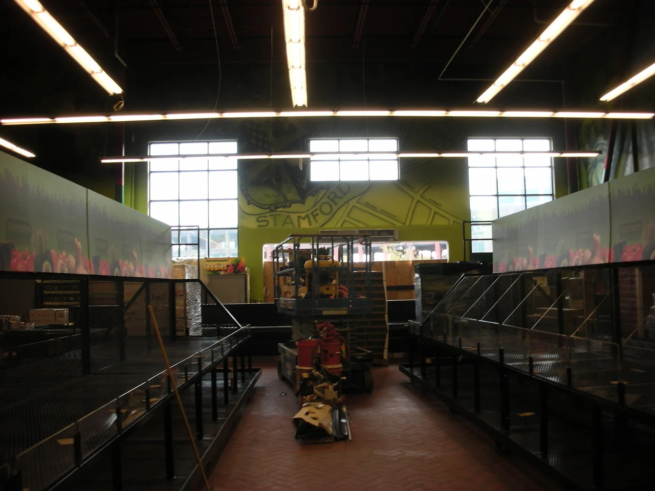 The shop is almost ready — the photo shows one part of the store that has a hand-drawn mural depicting Stamford streets (there are other painted murals throughout the place).