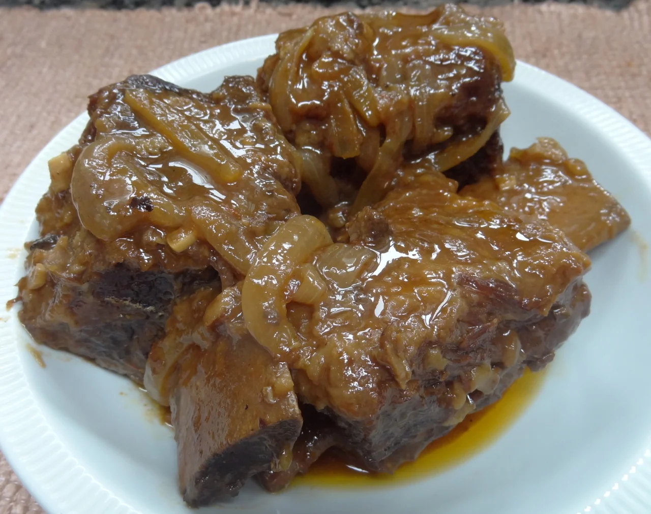 Dredge the meat in some flour and shake off the excess. Heat 2 tablespoons of the vegetable oil in a large saute pan over medium heat. Add the meat, a few pieces at a time and cook them for 3-4 minutes per side or until lightly browned. Remove the meat to a dish and set aside. Pour the remaining vegetable oil in the pan. Add the onions and cook, stirring occasionally for about 3 minutes. Add the garlic and cook briefly. Return the meat to the pan. Pour in the chili sauce, red wine, water, apple cider vinegar and honey. Add the bay leaf and ginger, stir the ingredients and spoon the sauce over the meat a few times. Sprinkle with salt and pepper if desired. Cover the pan, turn the heat to low and cook for about 4 hours or until the meat is tender. reduce the sauce if desired: skim the fat and cook at high heat. Makes 6 servings