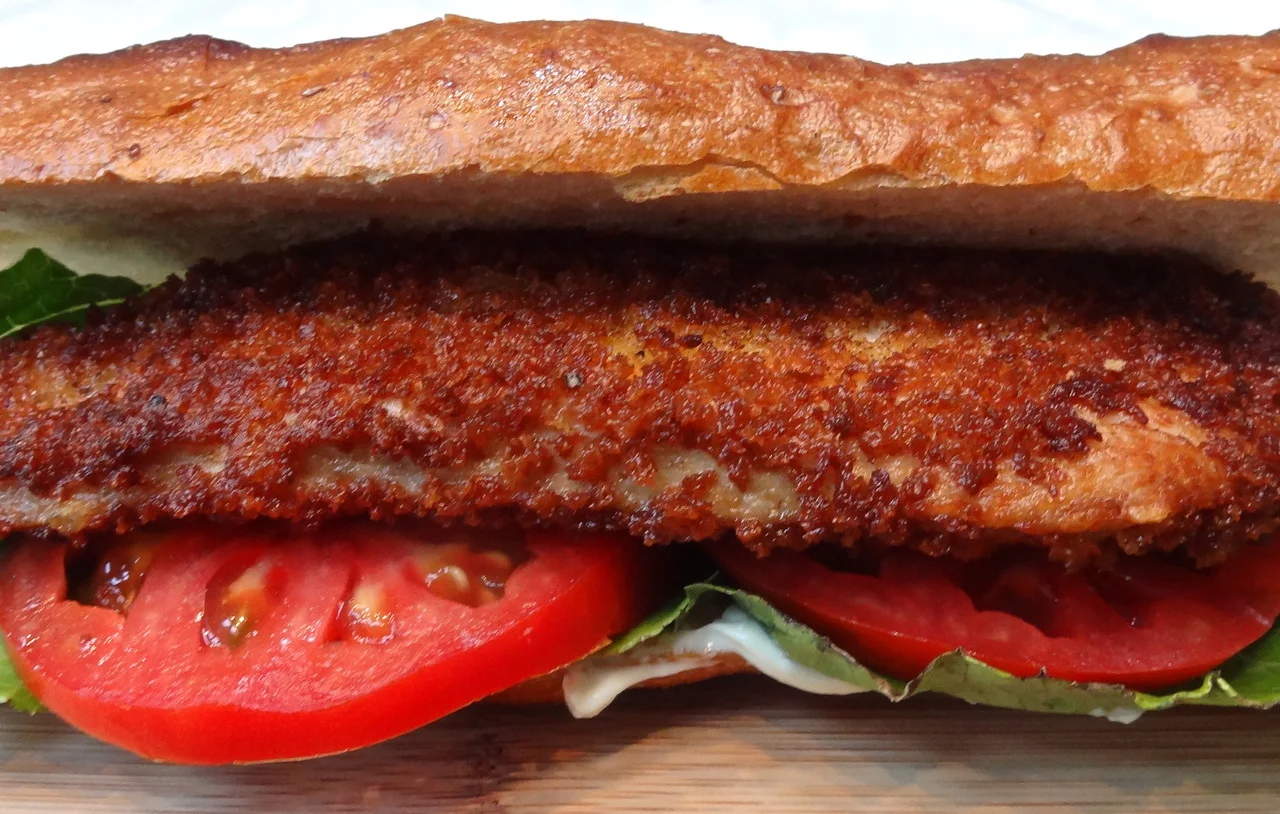 Beat the egg in a shallow pan or dish. Place the panko on a second dish. Add some salt, pepper, paprika and garlic powder to the panko and mix to distribute the spices. Immerse the chicken one piece at a time in the egg and turn to coat both sides. Then coat the chicken with the seasoned panko. Heat about 1/4-inch vegetable oil in a large saute pan over medium heat. Fry the filets — two at time if necessary to leave room in the pan between pieces. Cook the filets for 2-3 minutes per side or until crisped and cooked through. Drain on paper towels. Cut a baguette into four chunks. Slather with equal amounts of mayonnaise. Add lettuce and tomato slices, top with a chicken filet.