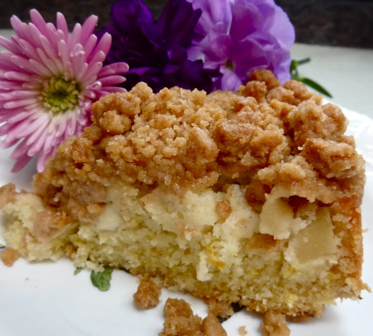 The cake was tender and vaguely lemony, with a layer of soft baked sliced apples and crusted with mocha-brown crumbles of streusel.