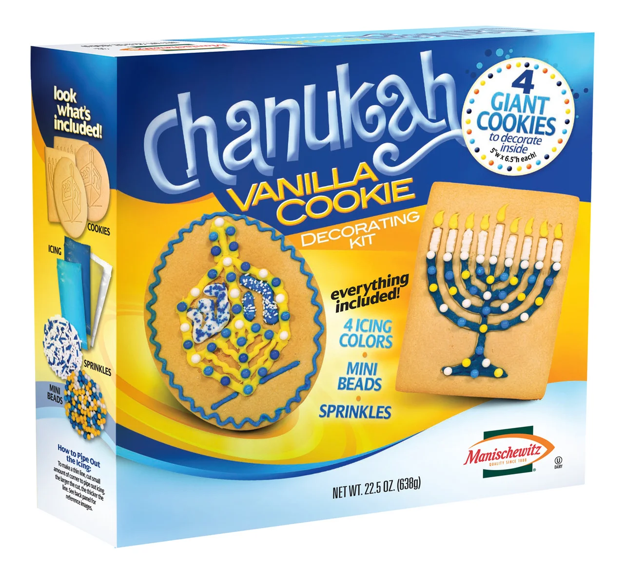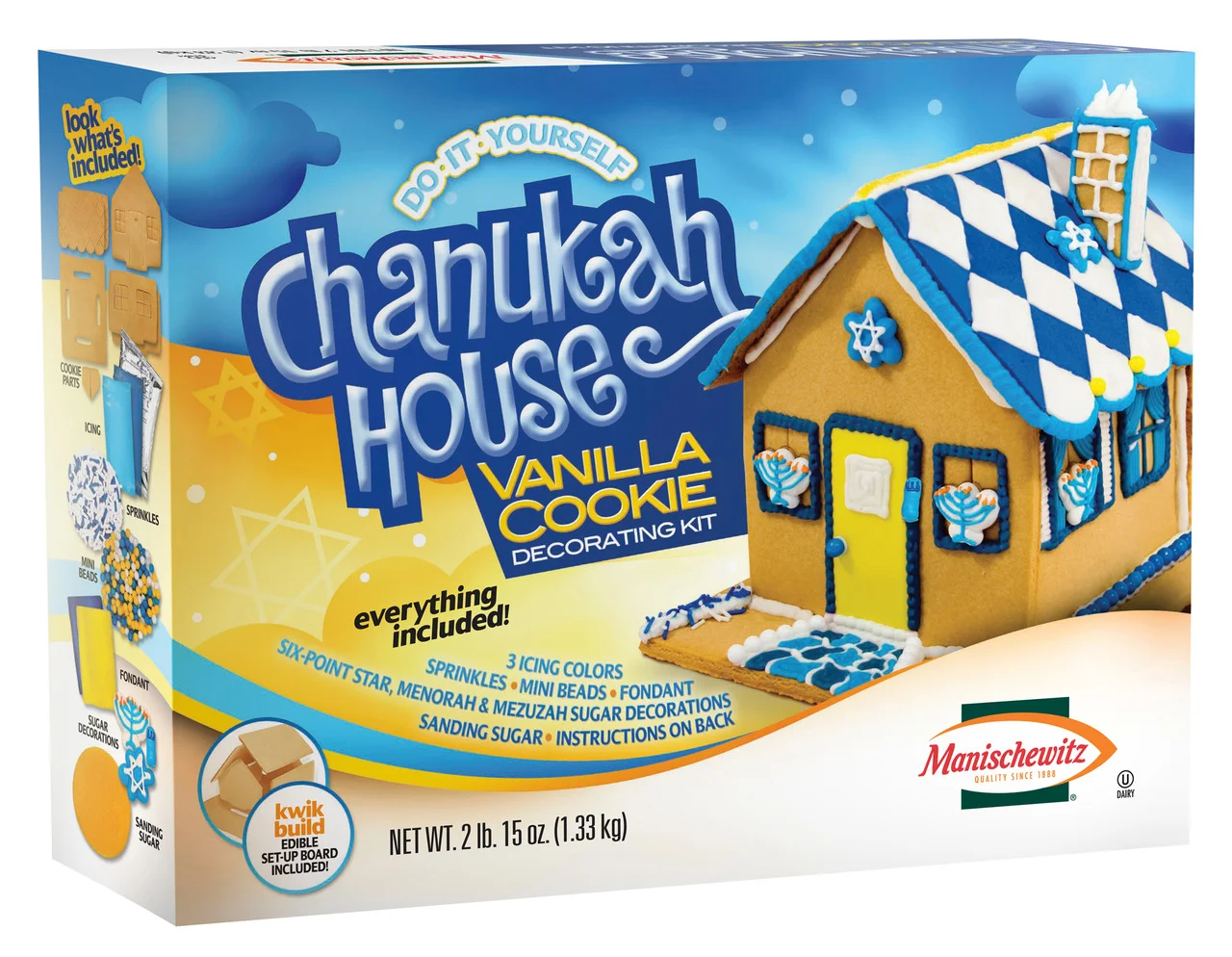 And for the kids, there’s the new Chanuka kits, a sort of kosher take on the seasonal gingerbread house. There are two kinds: a Chanuka Sugar Cookie Decorating Kit (4 vanilla cookies with Hanukkah (or Chanuka) themes, plus icing, beads and sprinkles; and a second, more elaborate Chanuka House Decorating Kit with all the goodies needed to make a holiday cookie house, decorated with icing and sugary things all over.