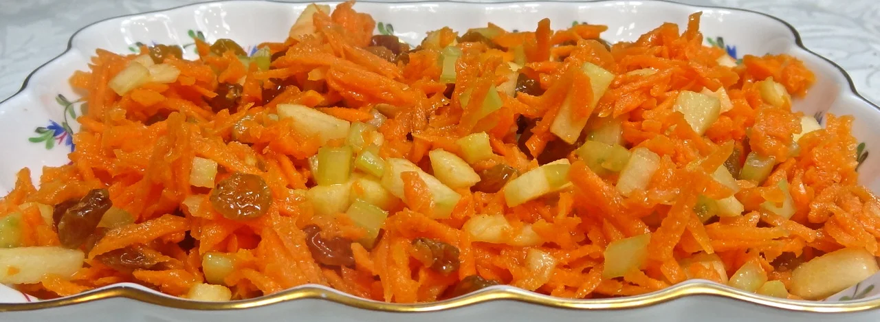 Place the carrots, apples, raisins and celery in a bowl. In another bowl, combine the lemon juice, honey, mustard and olive oil and blend the ingredients thoroughly. Pour over the carrot mixture and toss. Makes 8 servings