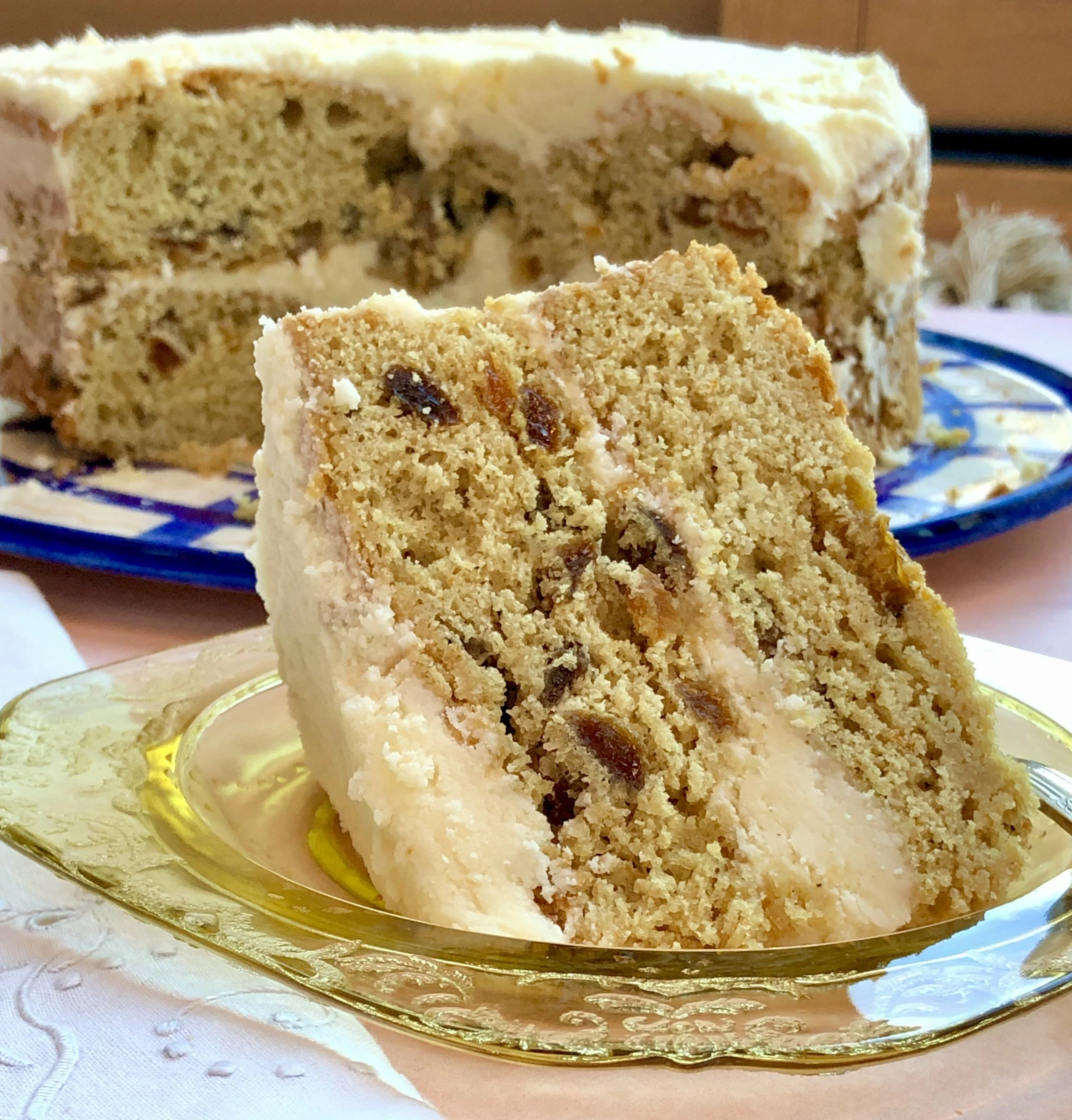 Preheat the oven to 350 degrees. Lightly grease two eight-inch cake pans. Line the bottoms with parchment paper and lightly grease the paper. Place the raisins and orange peel in a bowl, pour in the whiskey and let soak for at least 30 minutes. Combine the flour, baking powder, baking soda, salt, nutmeg and cloves in a bowl. Set aside. Beat the butter and sugar in the bowl of an electric mixer set at medium speed for 2-3 minutes or until smooth and well blended. Add the eggs and beat for another 2-3 minutes or until the mixture becomes smooth (scrape down the sides of the bowl with a spatula). Add the flour mixture and beat for 1-2 minutes to incorporate it into the other ingredients. Add the raisins (with any remaining liquid) and the orange juice and beat for another 1-2 minutes until a uniform batter has formed. Spoon the mixture into the cake pans. Bake for 20-22 minutes until a cake tester inserted into the center comes out clean. Let the cake cool in the pans for 10 minutes, then remove the cakes and let them cool completely. Make the frosting by beating the butter and confectioners’ sugar together until smooth. Gradually add the whiskey and beat until smooth. Frost the bottom layer, place the second layer on top and frost the top of the second layer.