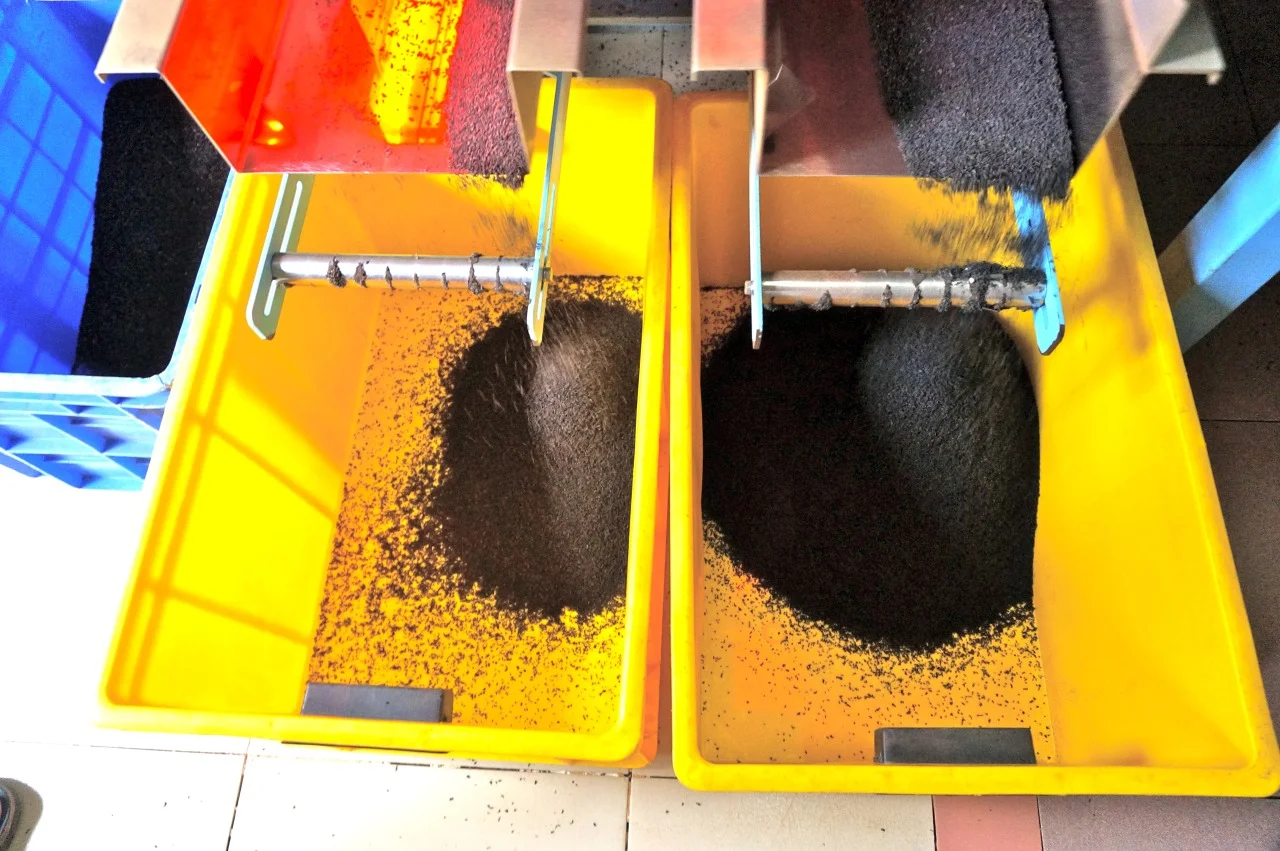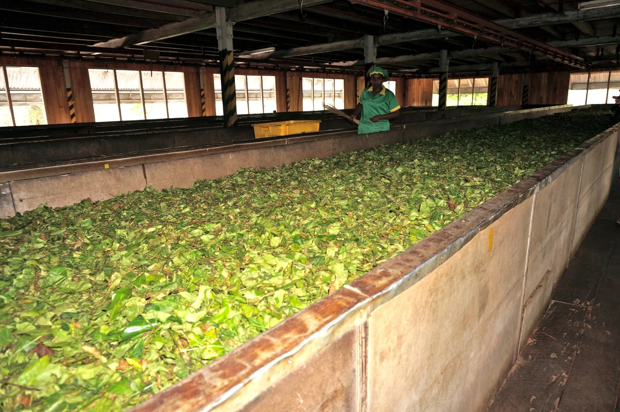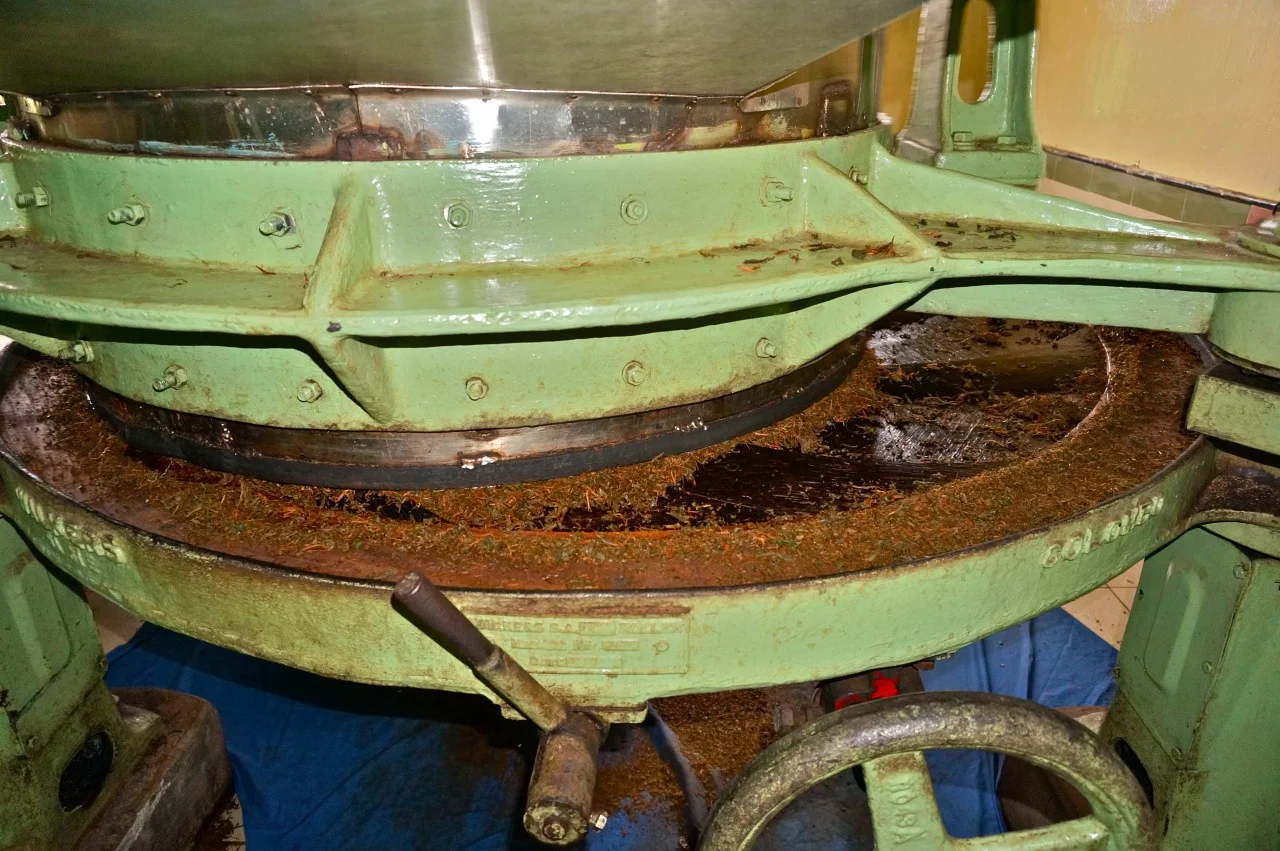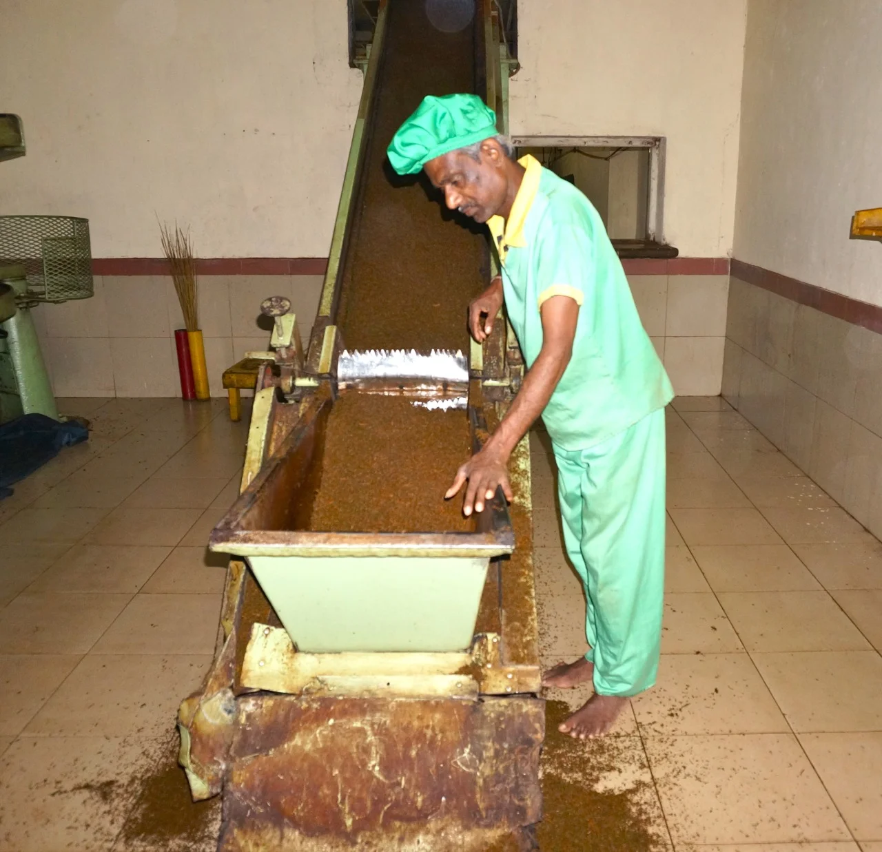 The plantation we went to wasn’t totally set up for visitors, but we were able to speak with some of the workers who showed us the entire tea-leaf process. You can see one of the women plucking the tops — only the new, light green growths are harvested (every 7 days on this plantation). Then (second photo), the leaves are placed in a bin to wither and dry. Once they dry somewhat they are sent (photo 3) to crushing machines (photo 4), which breaks the leaves. The leaves are then dried some more and as they dry they oxidize and change color from golden to dark blackish-brown, to achieve varieties of tea such as oolong and different black teas. (Green tea and white tea are not oxidized.)