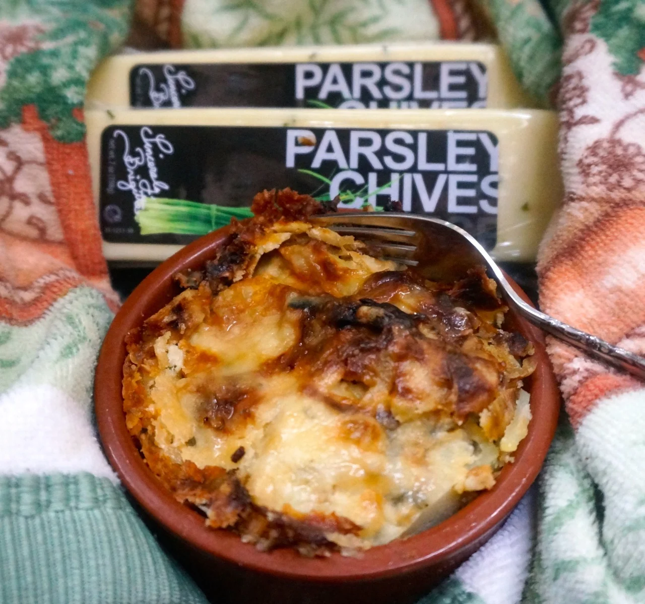 Potato Galette with Caramelized Onions and Sincerely Brigitte Parsley and Chives Cheese