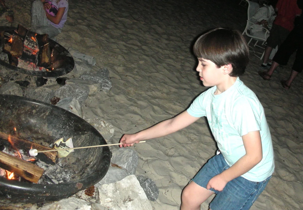 Of course, the simplest way to enjoy a marshmallow is to toast it over a fire to crispiness and eat it, ashes crumbling and insides oozing. Like my grandchild is doing in the photos.