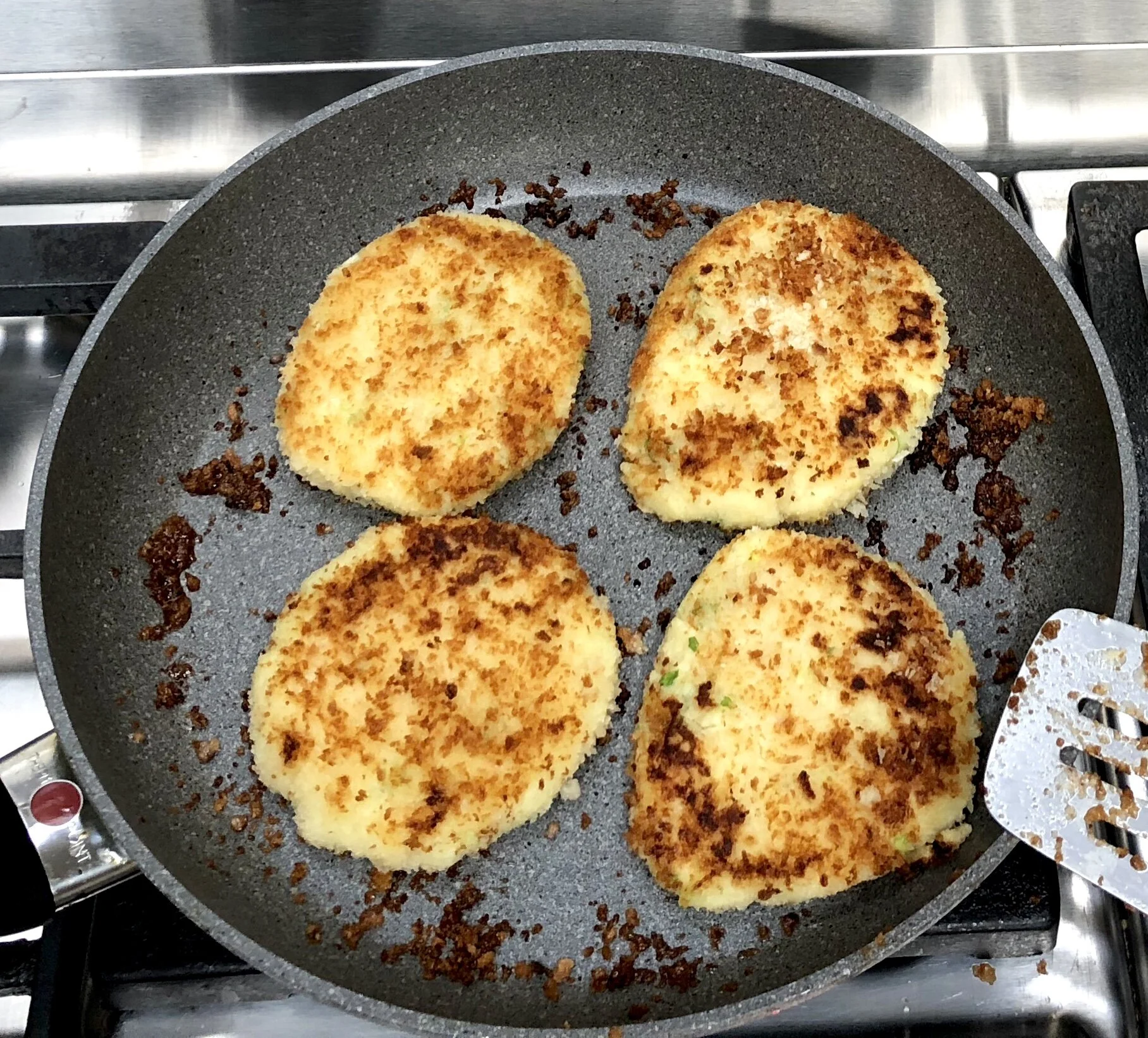 Mashed potato pancakes are very soft, so be careful when placing them in the pan and turning them.