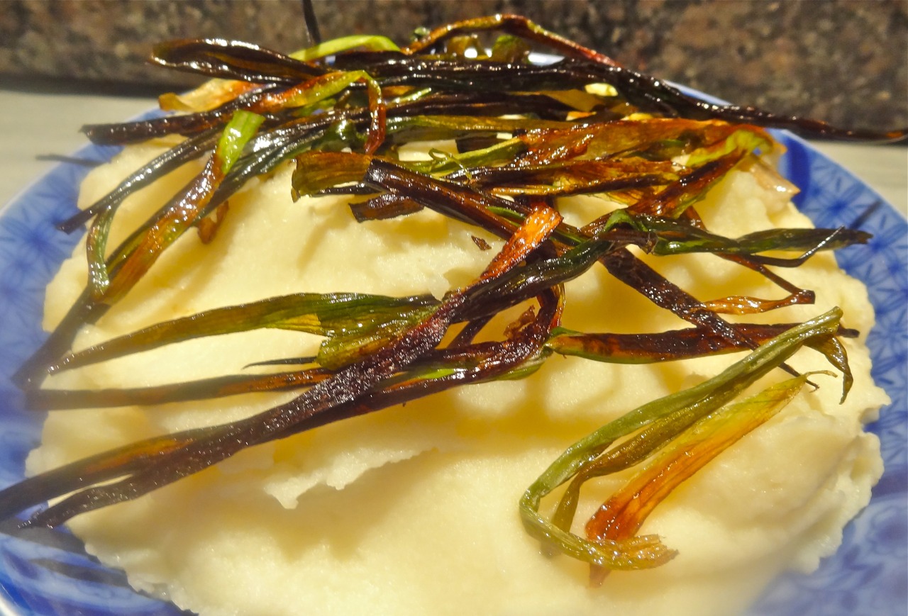 When we got back to the States I decided to create a variation on this theme. Here’s the result: mashed potatoes with scallions, but the scallions are fried and caramelized and I serve them on top because they are crisp and make a nice contrast to the soft and creamy stuff beneath.