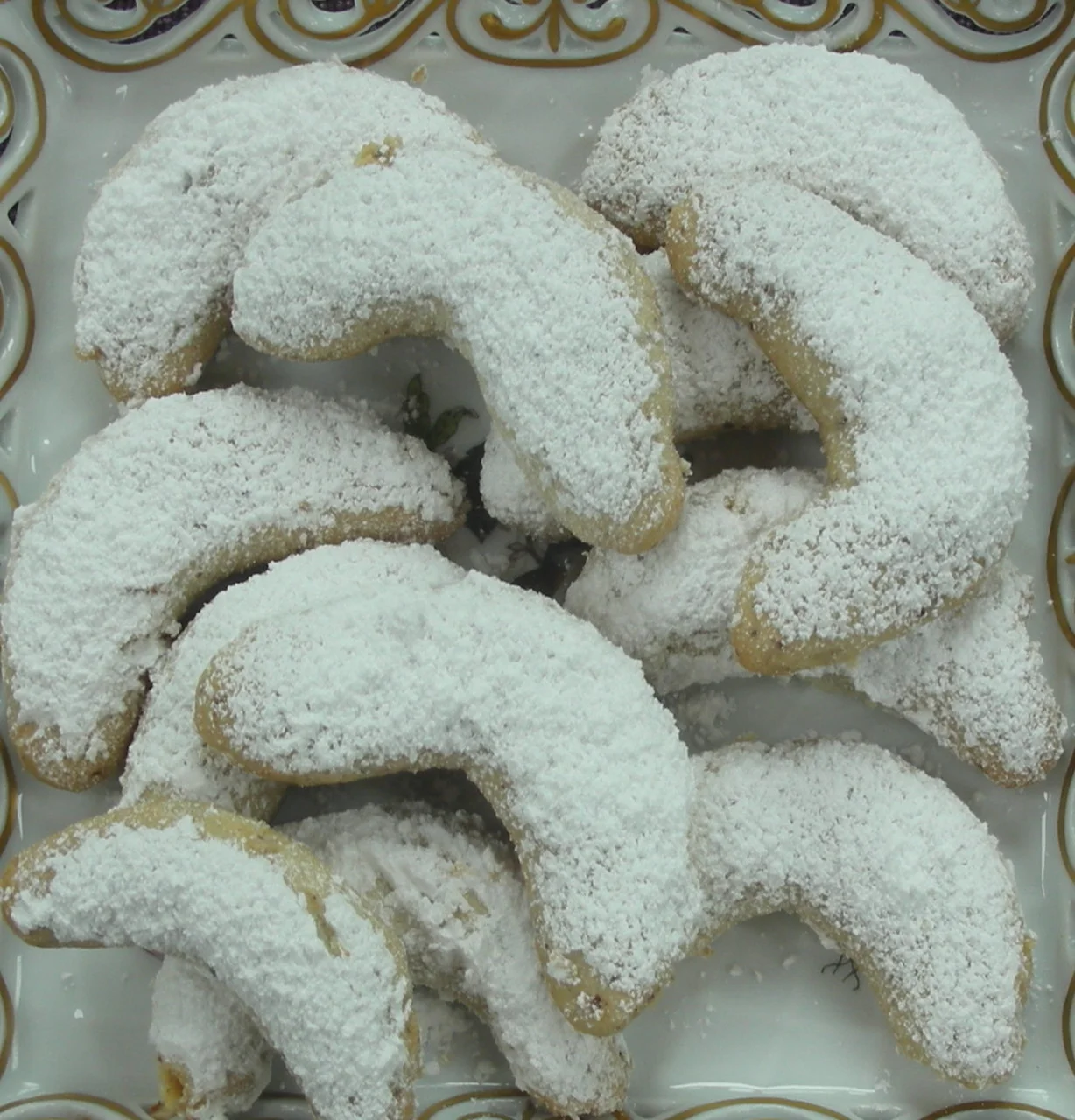 Preheat the oven to 325 degrees. Beat the butter and 1/3 cup confectioner’s sugar in the bowl of an electric mixer set at medium speed for one minute or until fluffy and well blended. Add the egg yolks, salt and vanilla extract and blend them in thoroughly. Add the flour and nuts and blend them in thoroughly. Wrap the dough and refrigerate it for at least one hour or until well chilled. Take off pieces of dough and shape them into 3-inch long cylinders, then into crescents with tapered ends. Place the crescents on ungreased cookie sheets about one-inch apart. Bake for about 25 minutes or until they are lightly browned. Let cool. Press the cookies into the remaining confectioner’s sugar or sift extra confectioner’s sugar on top of the cookies for serving.