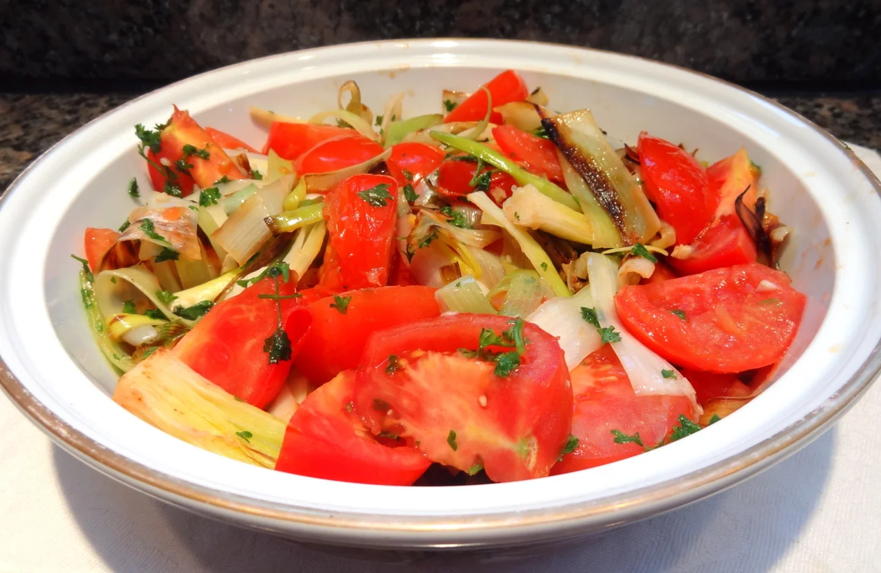 Cut the eggplant into slices about 3/8-inch thick. Sprinkle with salt and let rest for 30 minutes. Wipe the eggplant slices dry with paper towels. Preheat the oven to 350 degrees. Heat one tablespoon olive oil in a saute pan over medium heat. Cook the eggplant slices a few at a time for 2-3 minutes per side or until slightly wilted. Add more olive oil to the pan as needed to prevent scorching (use 4-5 tablespoons more if needed). Place the cooked eggplant into a baking dish (cut it into smaller pieces if you wish). Add 2 tablespoons olive oil to the pan. Add the leeks and cook for 2-3 minutes. Add the garlic and cook for another minute. Add the tomatoes, parsley, sugar, salt and lemon juice. Cook for one minute, stirring frequently. Spoon the vegetables on top of the eggplant. Drizzle with any remaining olive oil and the water. Cover the pan and bake for 45 minutes. Serve hot, warm or at room temperature.