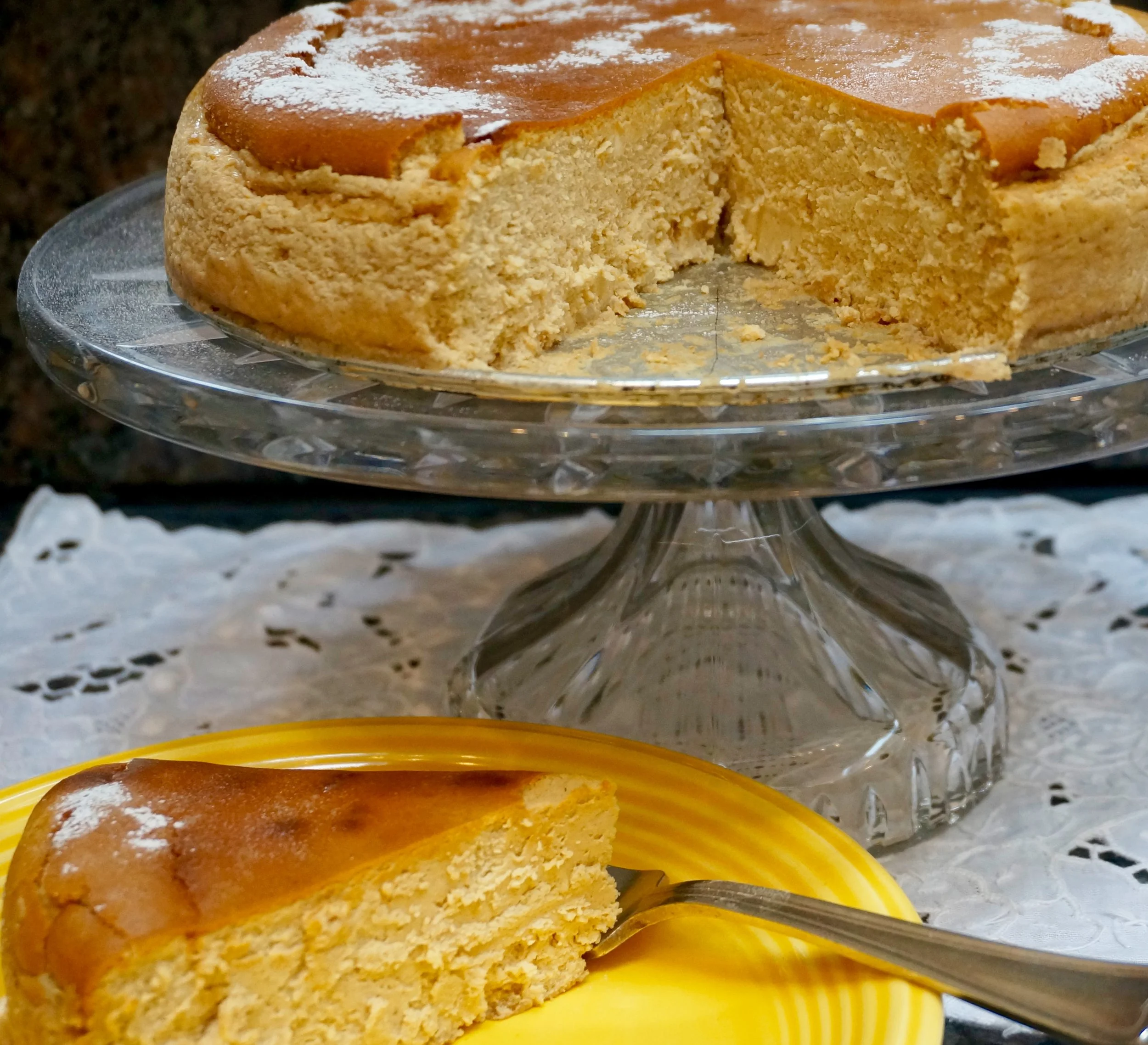 Spoon the mixture into the prepared pan. Place the pan in a larger pan. Fill the larger pan with enough water to come up about 1-inch on the sides of the springform pan. Bake for about one hour or until set. Remove the springform from the larger pan and let cool to room temperature. Refrigerate for at least 4 hours before removing the cake from the pan to cool completely. Sprinkle with confectioner’s sugar or candied ginger if desired.