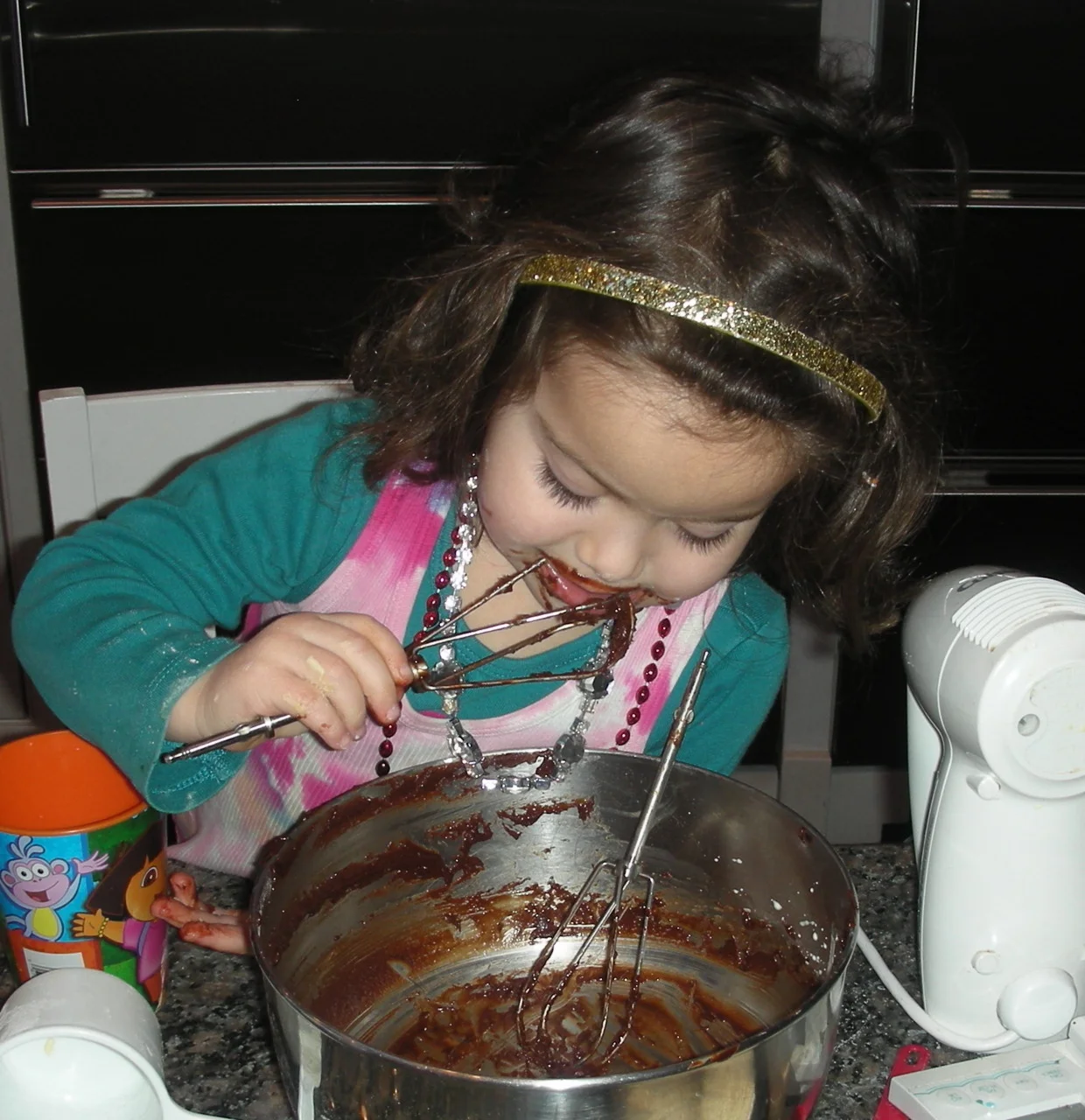 This picture shows my granddaughter Nina, almost 4, after making a batch of our favorite chocolate-chip brownies. Her brother and cousins weren’t at my house so she had the beaters, spatula, wooden spoon and bowl all to herself.
