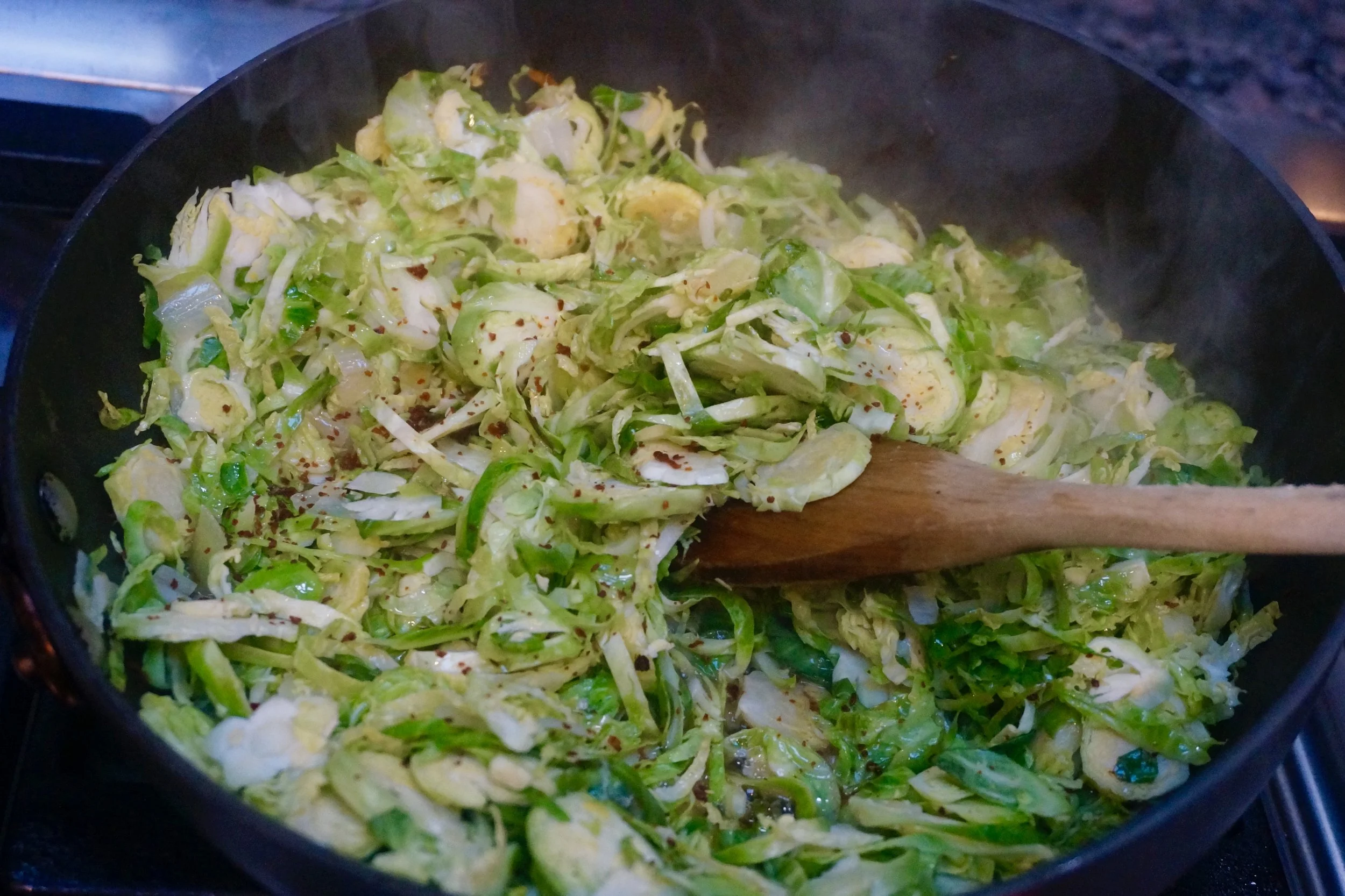 In preparation for the article, I experimented with several recipes. My kitchen was laden with pots and pans, all sots of seasonings and of course, a ton of Brussels sprouts.