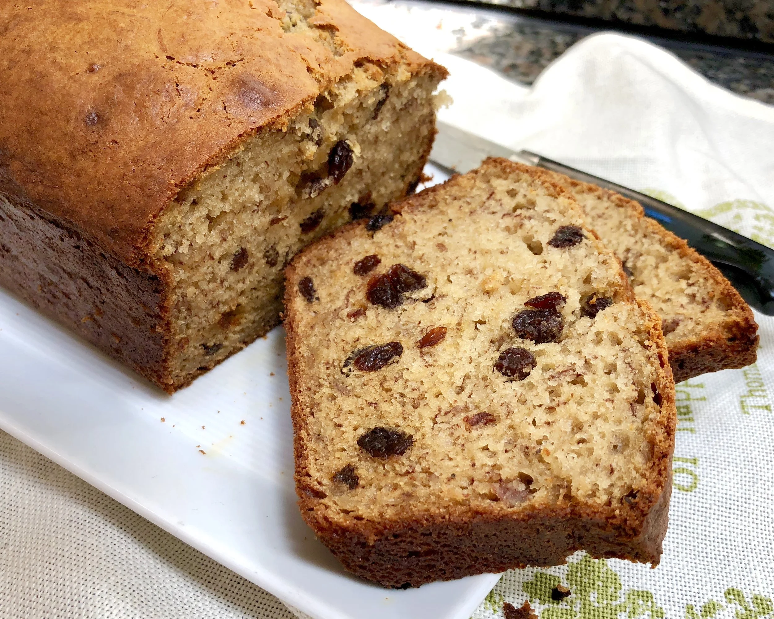 This one is moist, gently warmed with cinnamon and studded with raisins (although you could substitute dried cherries or cranberries and such). It looks lovely, both whole and when sliced. And I can tell you that all my usual tasters have said it was delicious.