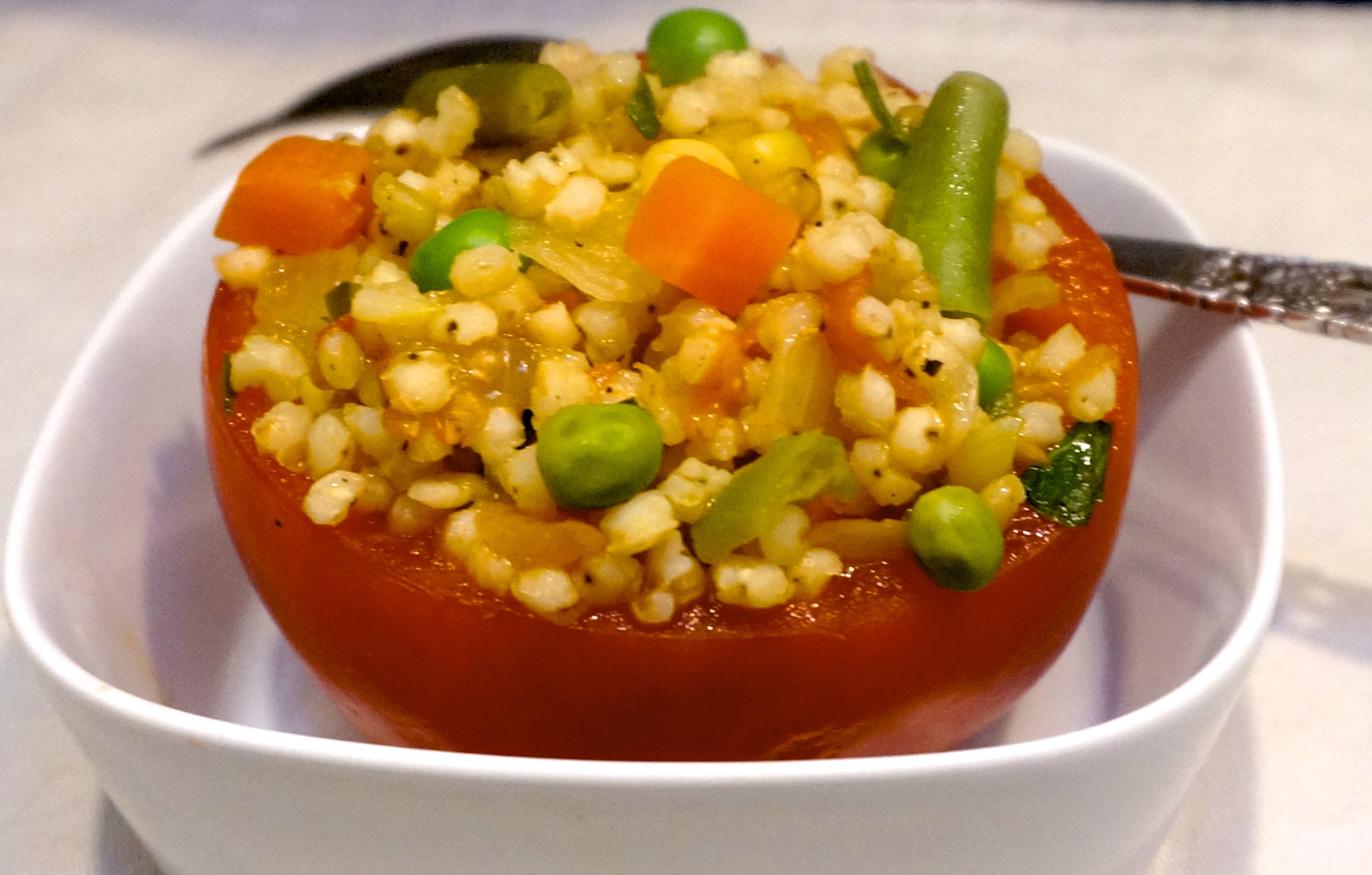 Last night I mixed it with vegetables to use as a side dish with dinner. Not only did it taste good, it was colorful and lovely to look at on the plate, which always makes dinner much nicer. Early in the day I stuffed the sorghum-veggie mix into hollowed out tomatoes and baked them several hours later, so this is a good make-ahead dish.