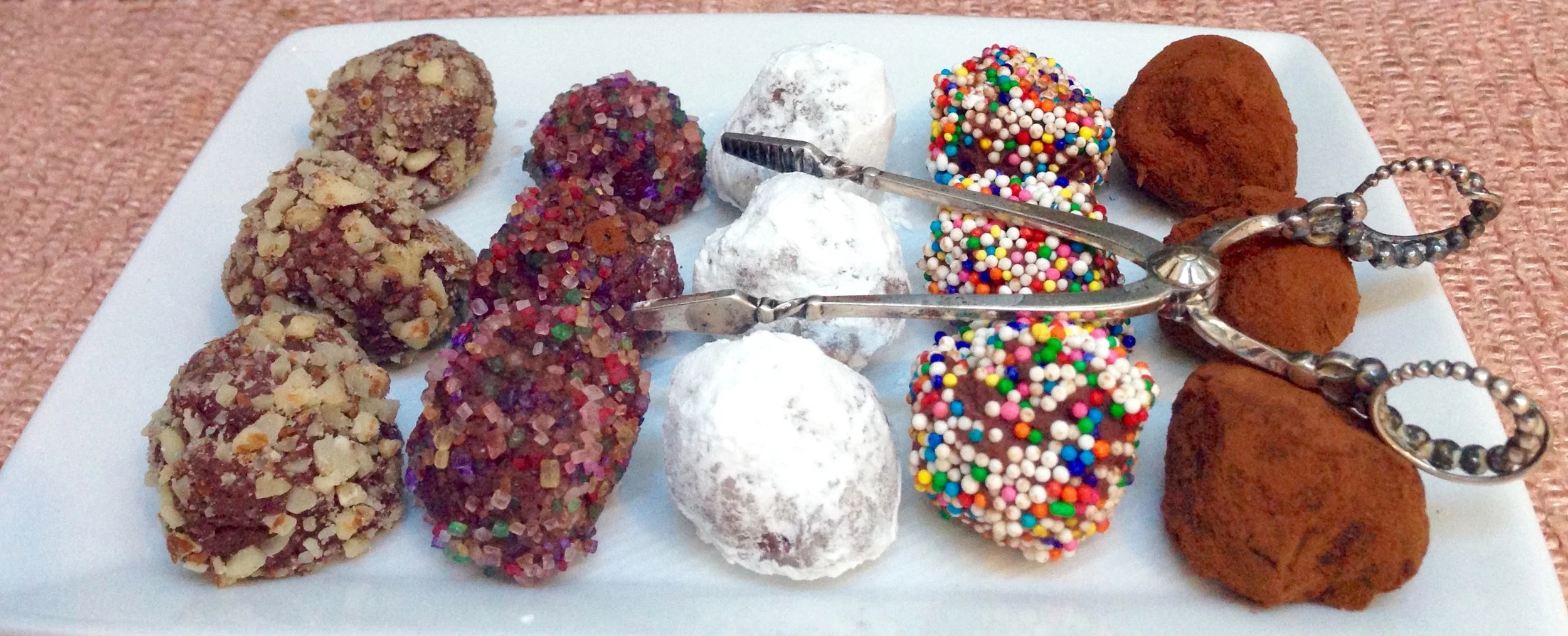 Check out the photo and you'll notice that I don't make my truffles perfectly rounded. Candy truffles get their name because they look like the the underground fungi, the ones that are highly fragrant and are dark, small and irregularly shaped. So the sloppy look is actually more authentic.