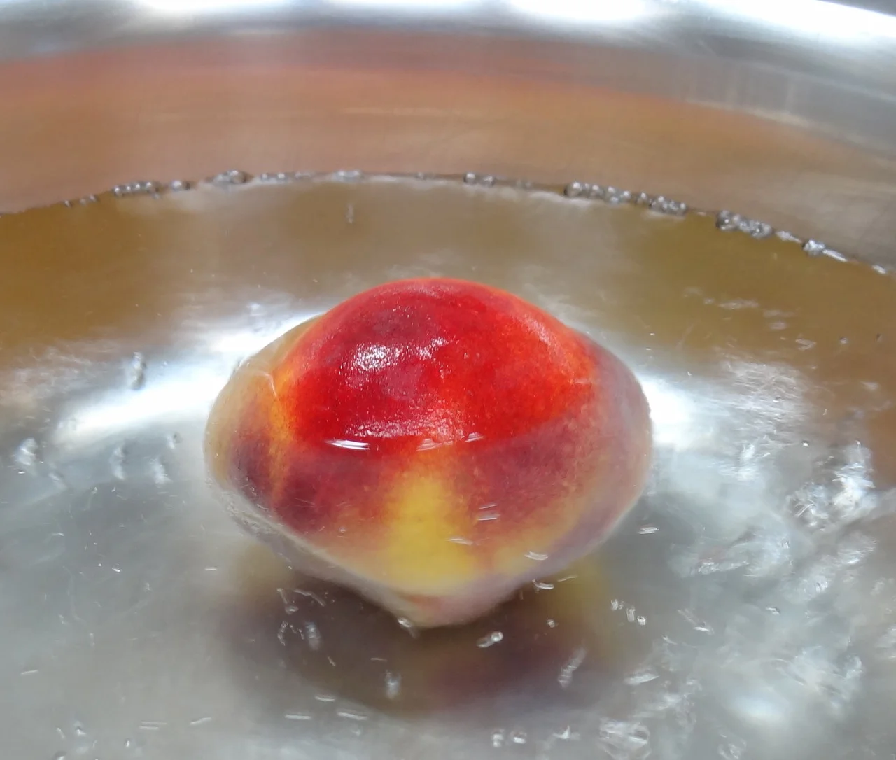 Wash the peaches (photo 1). Bring a large pot of water to a boil and add the peaches (photo 2). Cook for 20 seconds. Drain under cold water. With the tip of a sharp knife, pierce the skin at the stem end and pull down the skin, which will come off easily (photo 3). When all the skin has been removed, cut the peach in hlf (photo 4), remove the pit and slice, chop, etc.