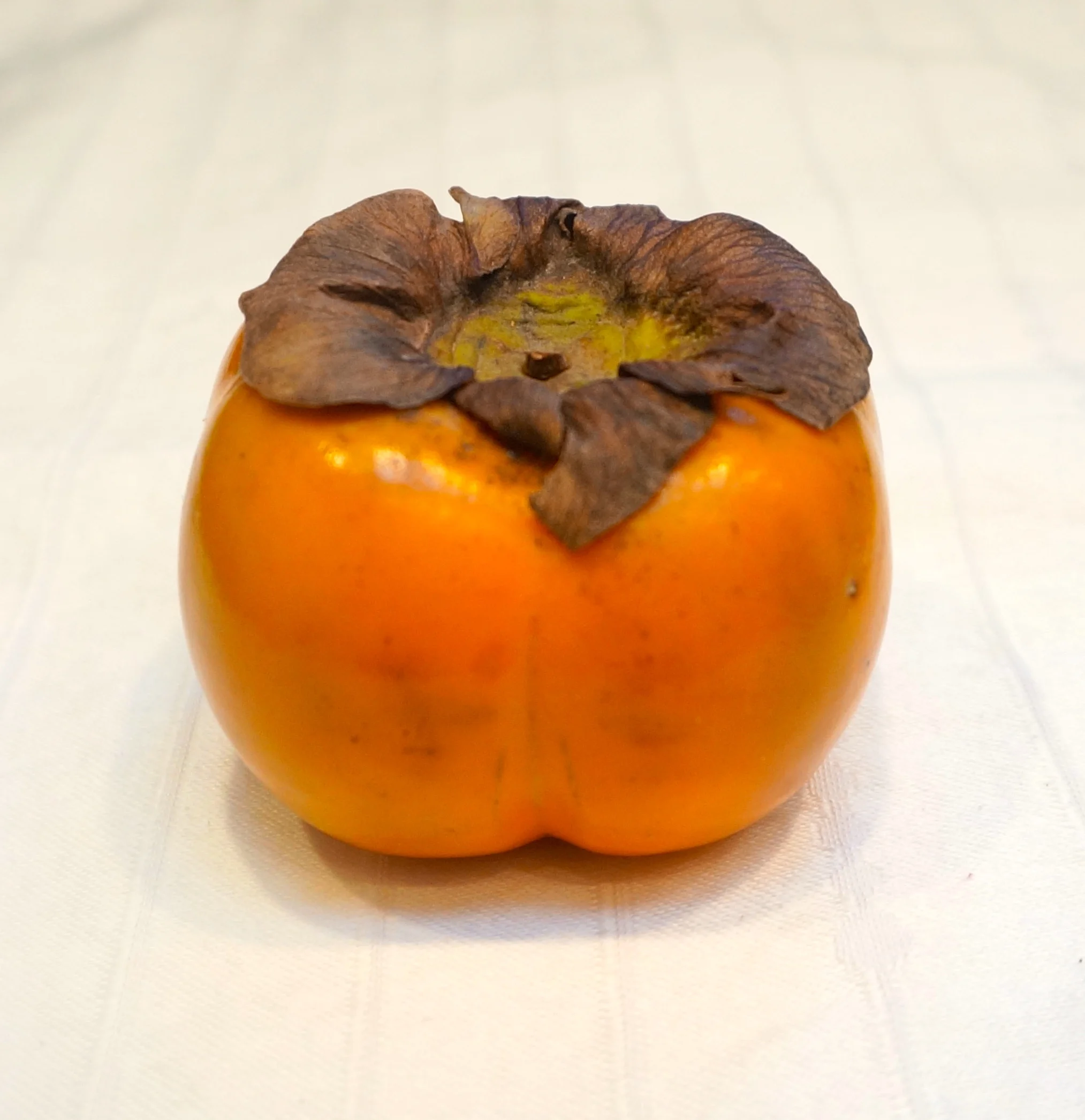 You guessed it: a Fuyu persimmon, now in season and at your supermarket if you're lucky and the produce manager ordered some. Buy them soon -- unlike strawberries and asparagus, which used to be seasonal items but are now always available, you can only get persimmons for a short time.