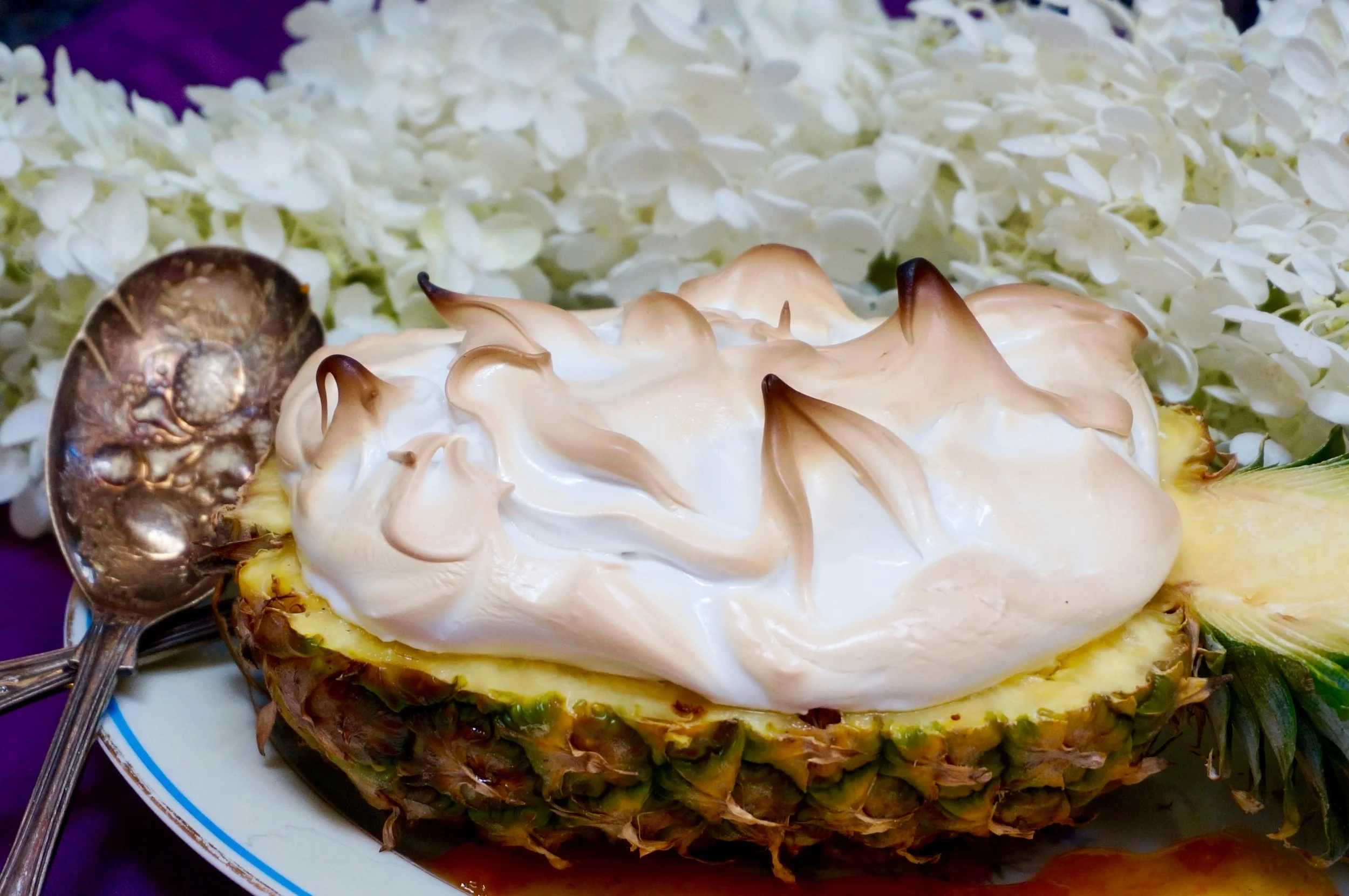 BAKED MARINATED PINEAPPLE WITH MERINGUE TOP