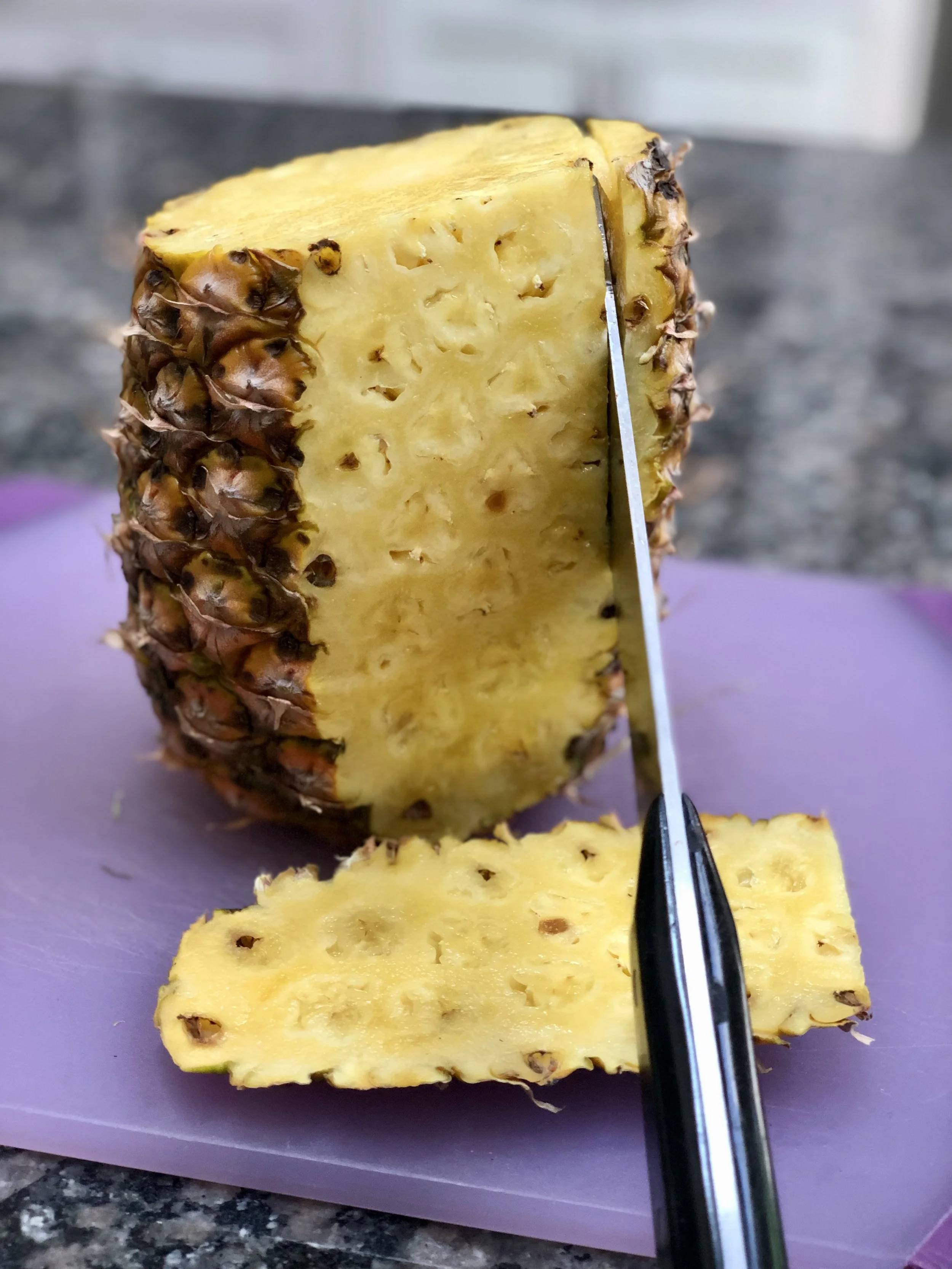 Using a chef’s knife, remove the leaves and hard outer shell of the pineapple. Cut the pineapple lengthwise into 1-inch thick strips. Using the knife, remove and discard the middle, fibrous core (from each slice you will be left with two strips of pineapple cut from both sides of the core). Place the strips on the parchment-lined jelly roll pan.