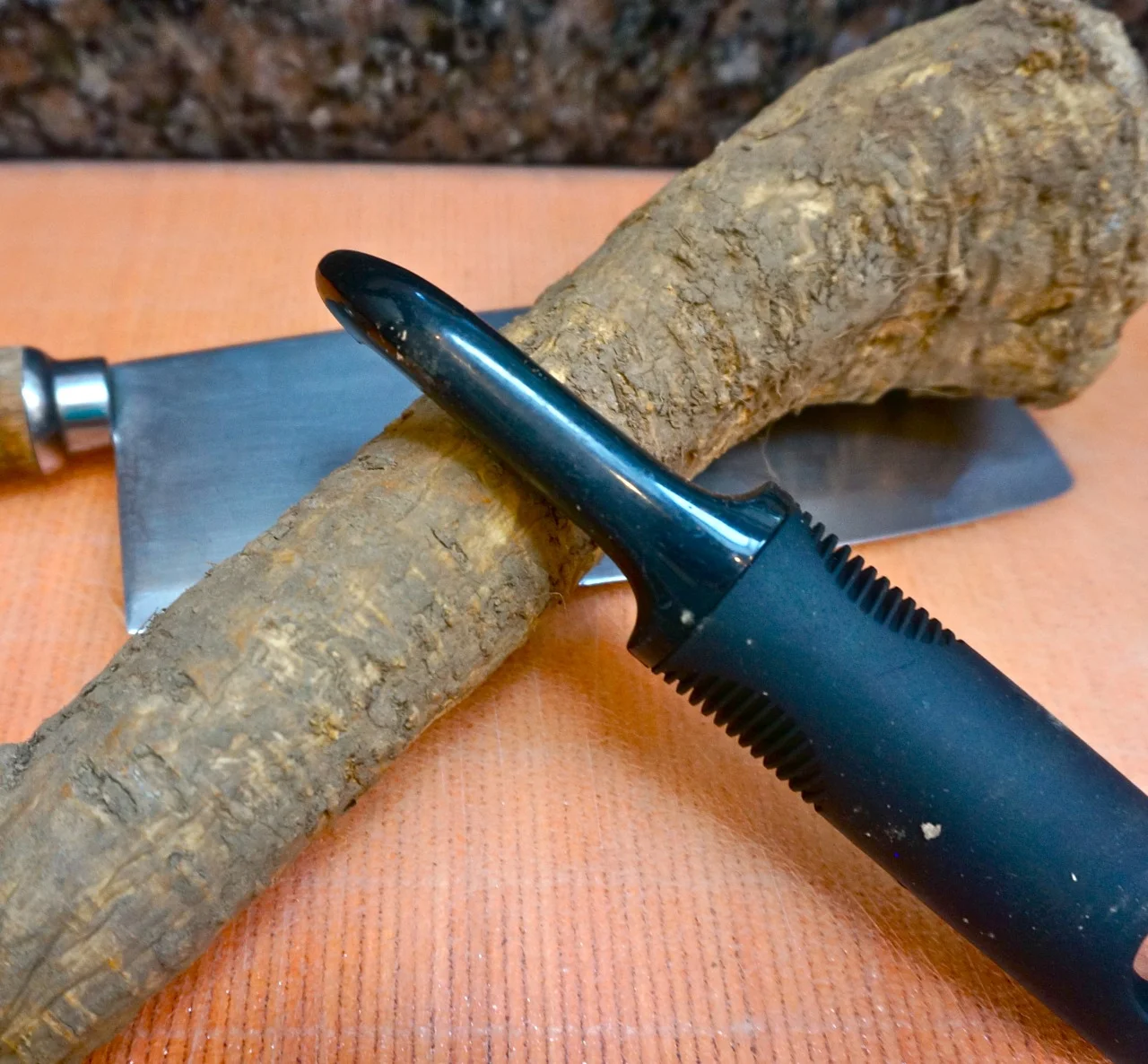 I’ll say something similar for horseradish. Whoever first tried it must have been awfully hungry. Horseradish is truly ugly, with an irregular shape and knobby bumps and hairy tendrils growing out of it. So it isn’t as if that brave soul couldn’t have resisted.