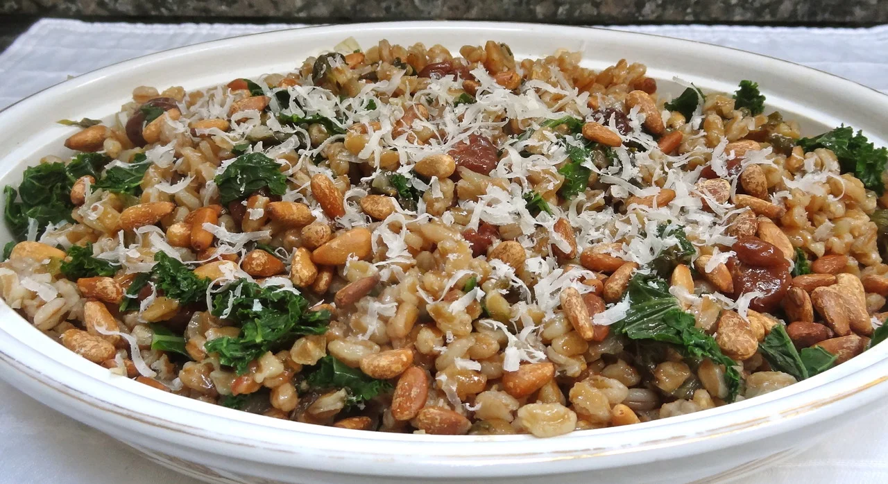 Wash the kale leaf by leaf to get rid of any dirt or sand. Remove and discard the thick stems. Chop the leaves and thin stems coarsely and set them aside. Heat the olive oil in a saute pan over medium heat. Add the onion and kale and cook for about 2 minutes. Add the garlic and cook for another minute. Add the farro, currants, parsley and salt and pepper to taste. Stir the ingredients. Pour in the stock. Bring the liquid to a boil and cook for one minute. Cover the pan, lower the heat and cook for about 25 minutes or until all the liquid has been absorbed. Sprinkle with the pignoli nuts, stir and place in a serving bowl. Sprinkle with cheese if desired. Makes 6 servings