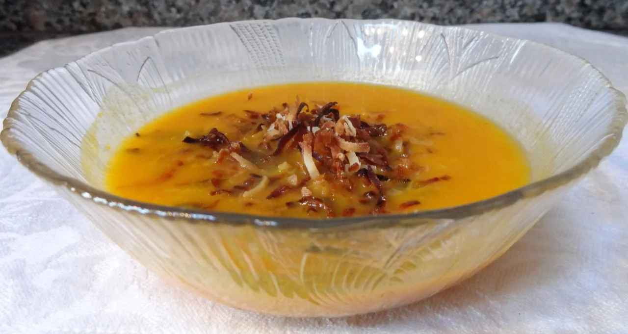 That is an exact quote from my husband after tasting a carrot soup I made recently. It’s got some heat, thanks to Harissa (a peppery condiment originally from North Africa). But the spiciness is tamed by rich, creamy, coconut milk.
