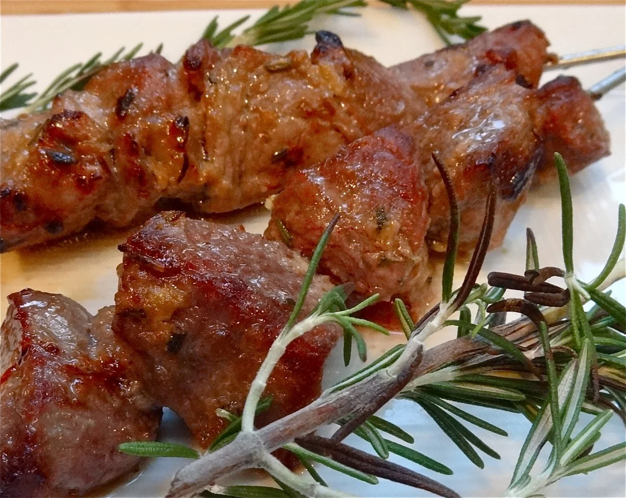 Place the lamb in a bowl. In another bowl, mix the marmalade, jam, mustard, garlic, ginger, rosemary and chili pepper. Sprinkle with salt to taste. Mix well and spoon over the lamb. Toss the meat in the jam mixture to coat all the pieces. Let marinate in the refrigerator for 1-2 hours. Preheat an outdoor grill (or oven broiler). Thread the meat pieces onto 4 skewers. Grill for about 8-10 minutes, turning the kebabs occasionally, or until nicely browned. (You can use an oven broiler.)