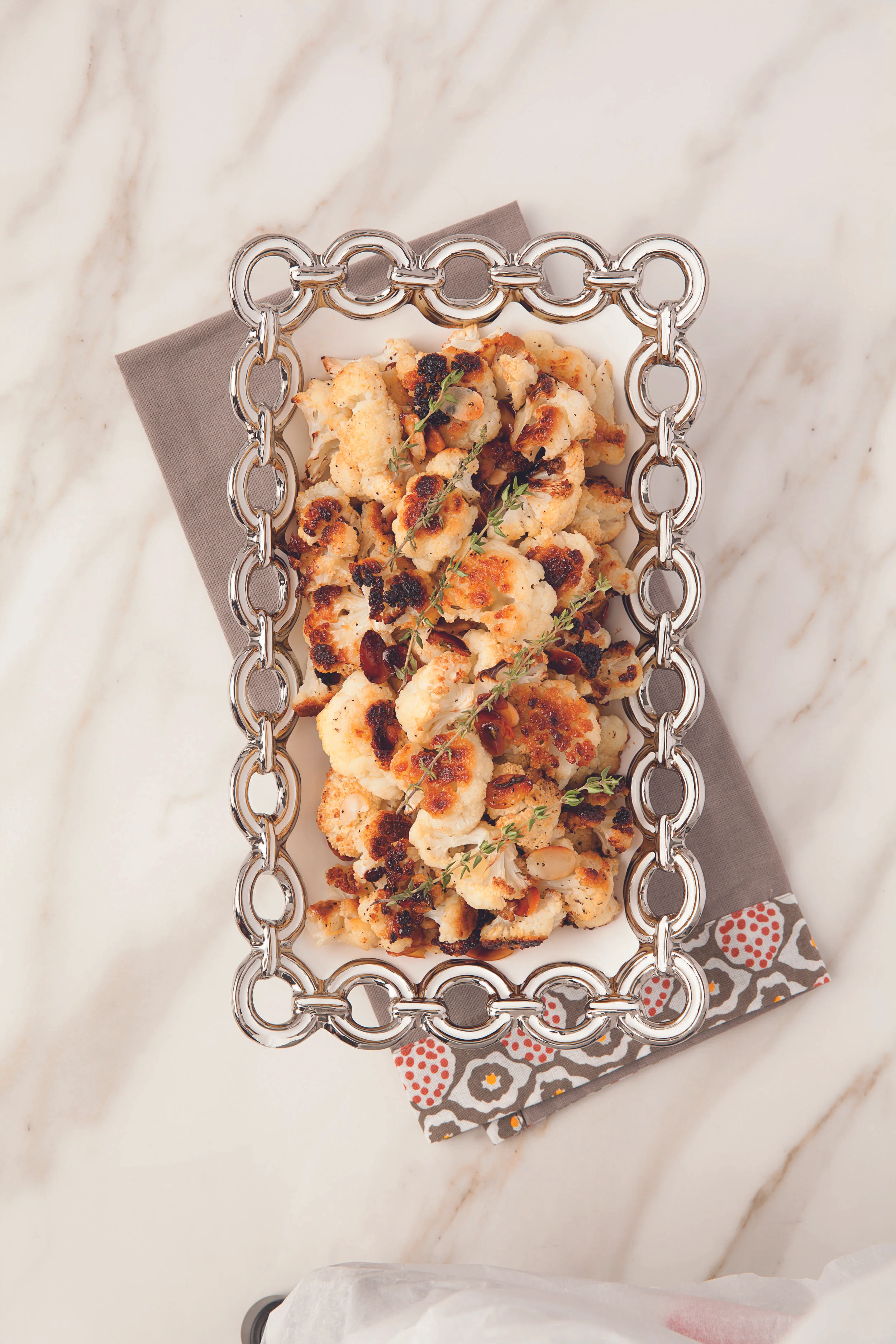 Candied cauliflower, drizzled with honey and thyme and topped with sliced almonds, is a beautiful dish that will keep your guests coming back for more. I suggest you double the recipe!