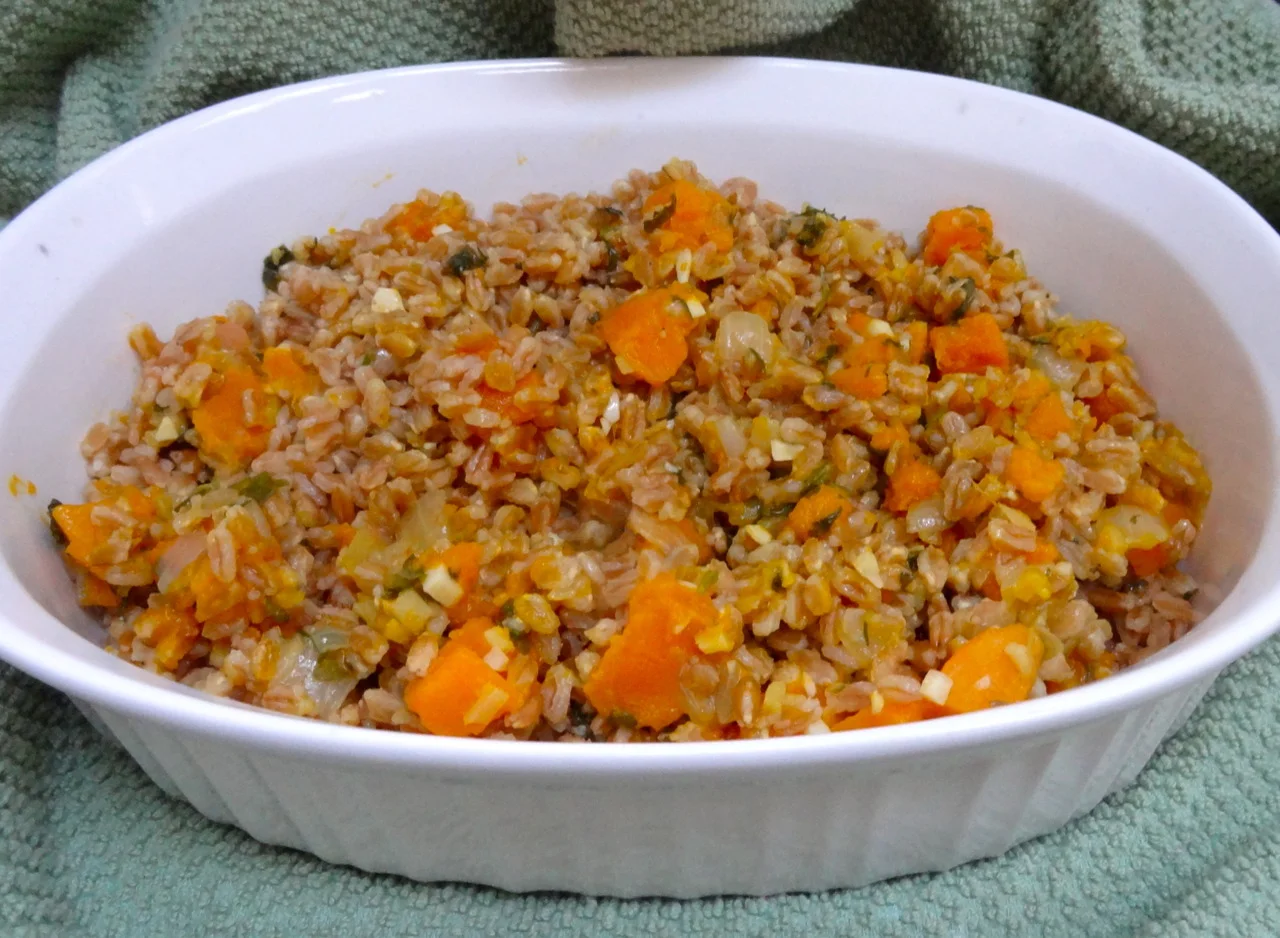 Heat the olive oil in a large saucepan over medium heat. Add the onion and cook, stirring occasionally, for 2 minutes or until the onion has softened slightly. Add the garlic, ginger and squash and cook, stirring occasionally, for another minute. Stir in the farro, parsley and thyme. Season with some salt and pepper. Pour in the stock. Bring the liquid to a boil. Boil for one minute. Turn the heat to medium-low, cover the pan and cook for about 25 minutes or until all the liquid has been absorbed. Makes 6 servings
