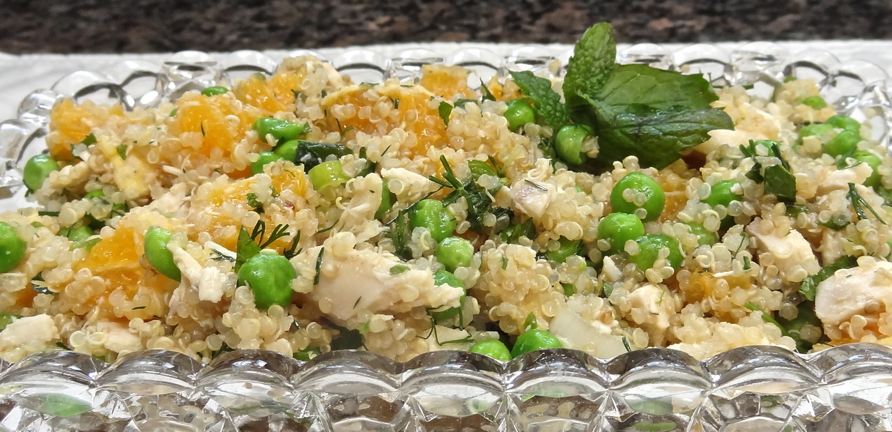 Place the quinoa in a strainer and rinse thoroughly with cold water. Let drain. Bring 1 cup of water to a boil, add the quinoa, stir, lower the heat and simmer, covered, for about 15 minutes, or until all the liquid has been absorbed and the grains are tender. Remove the pan from the heat and spoon the quinoa into a bowl to cool. Peel the orange(s) and remove as much of the white pith around the segments as possible. Cut the oranges into bites size pieces and add to the quinoa. Add the chicken, peas, scallions, dill and mint and toss ingredients to distribute them evenly. Pour the olive oil, orange juice and lemon juice into the salad and toss. Season to taste with salt and pepper. Let rest for at least 15 minutes before serving. Makes 4-6 servings