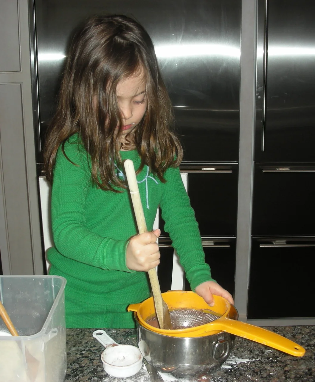 Today we cooked chocolate pudding. You can see Lila here, diligently pushing the cocoa powder, sugar and cornstarch through the strainer. Some of the mixture is on the counter, some on her pajamas, but she’s really good at this and I’d say 99% stayed in the bowl.