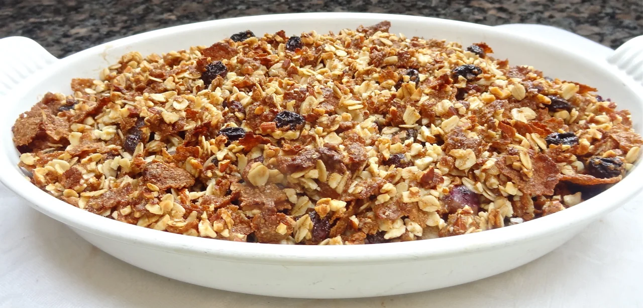 What’s one of the best things you can do with boxed breakfast cereal? Use it as crust for fruit crisps!