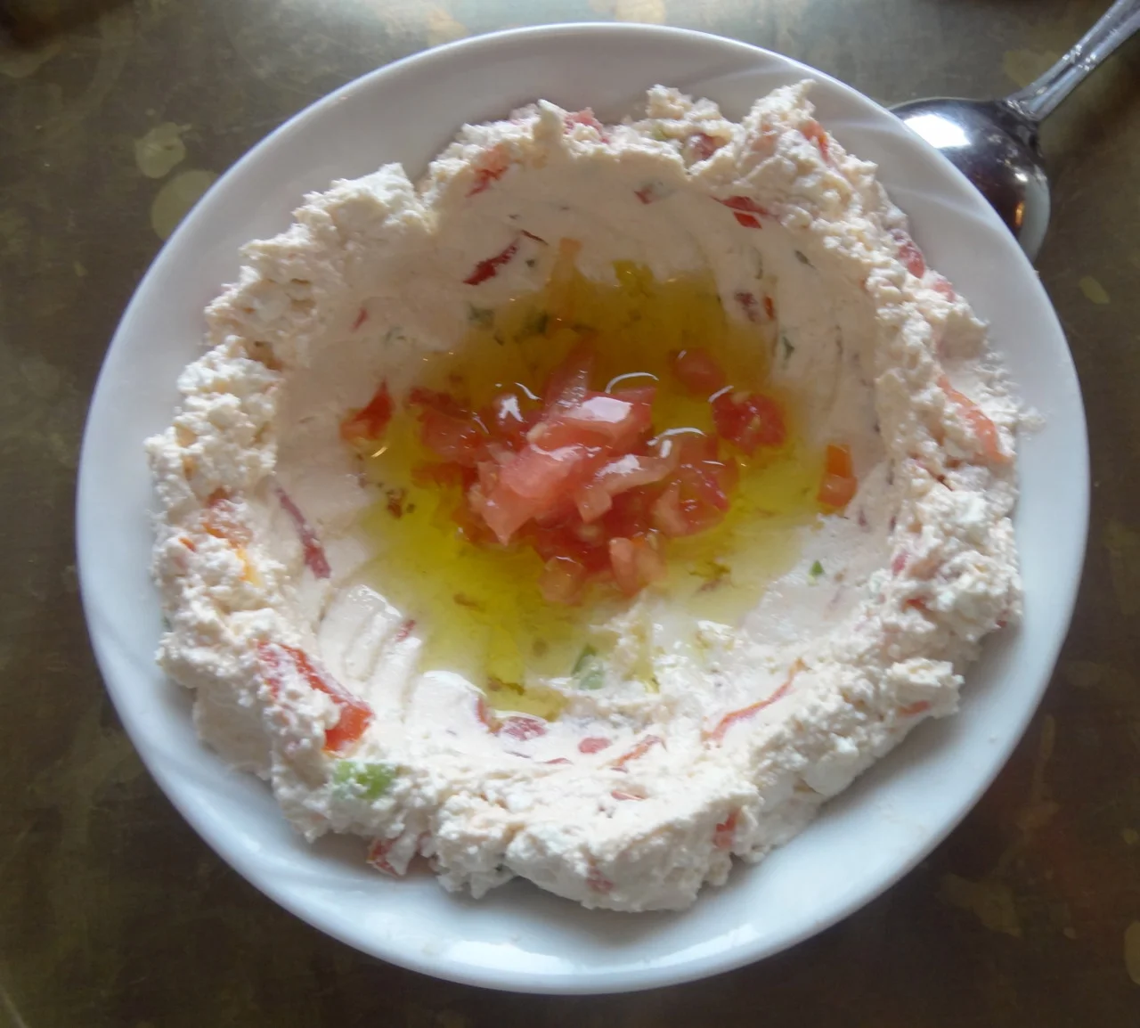 Mash 6-8 ounces of feta cheese with about 2 tablespoons olive oil and about 2 tablespoons lemon juice. Beat until creamy. Add plain yogurt if desired for a creamier consistency. Add 3 chopped scallions, 8-10 chopped cherry tomatoes and 2 tablespoons chopped parsley or one tablespoon chopped fresh mint if desired. Mix thoroughly. Serve drizzled with olive oil and chopped tomatoes. Serve with pita bread. Makes 6 servings