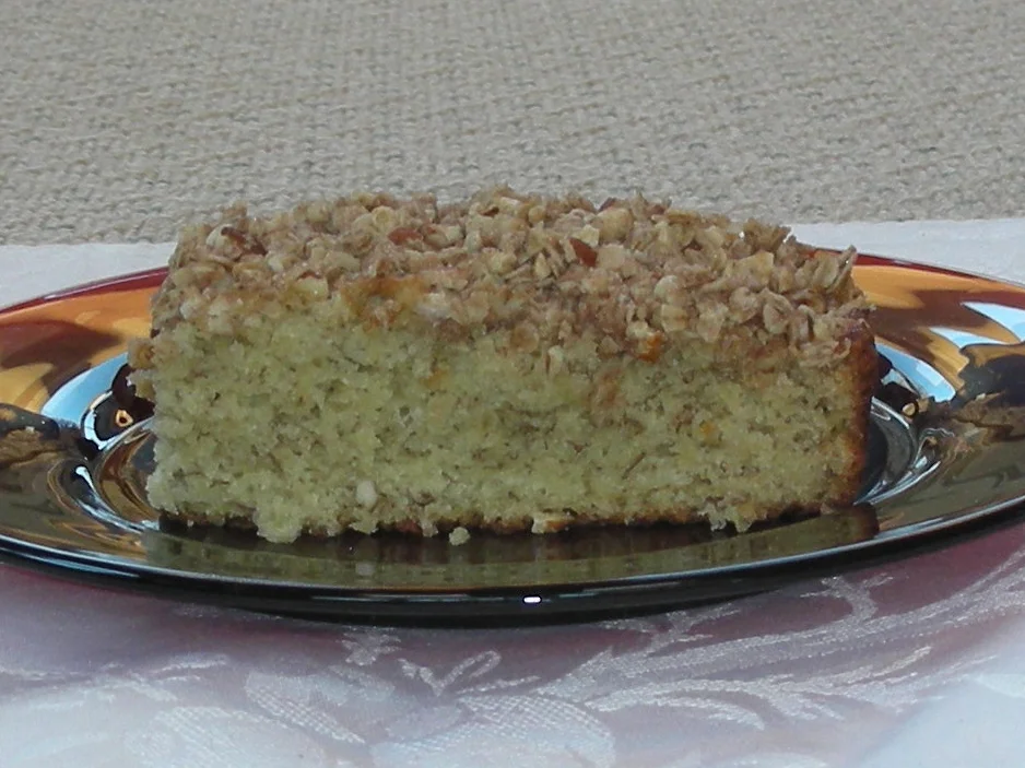 Preheat the oven to 350 degrees. Make the crust and set it aside. Mix the flour, salt, baking powder and baking soda together in a small bowl. In the bowl of an electric mixer, beat the butter and sugar together at medium speed for 2-3 minutes or until creamy and well blended. Add the eggs and bananas and beat the ingredients for another 2-3 minutes or until thoroughly blended. Add the flour mixture alternating with the buttermilk and blend in ingredients thoroughly. Stir in the vanilla extract. Spoon the batter into the prepared pan. Cover the top evenly with the crust mixture. Bake for 22-25 minutes or until a cake tester inserted into the center comes out clean. Makes 12-18 servings