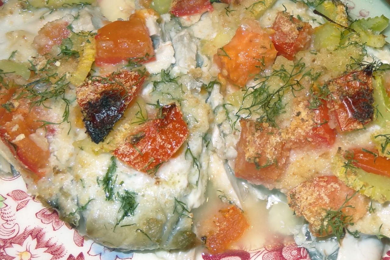 I make bluefish the way I saw my grandmother made it many years ago. Sometimes I slather some Dijon mustard on the flesh, other times I just use a dab of olive oil and some lemon juice. Then I cover it with lots of tomatoes, celery and dill and bake it. For the last minute or so I put it under the broiler to crisp the surface (although recently I have been baking it in a convection oven and there’s no need for the broiler).
