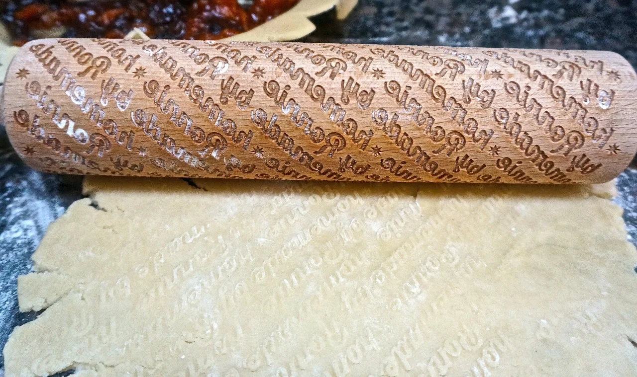 Okay, so I used the mixed up piece of dough for the bottom crust and rolled the top crust using a regular rolling pin, then gave it a final flourish with the carved one, to get the words onto the pastry.